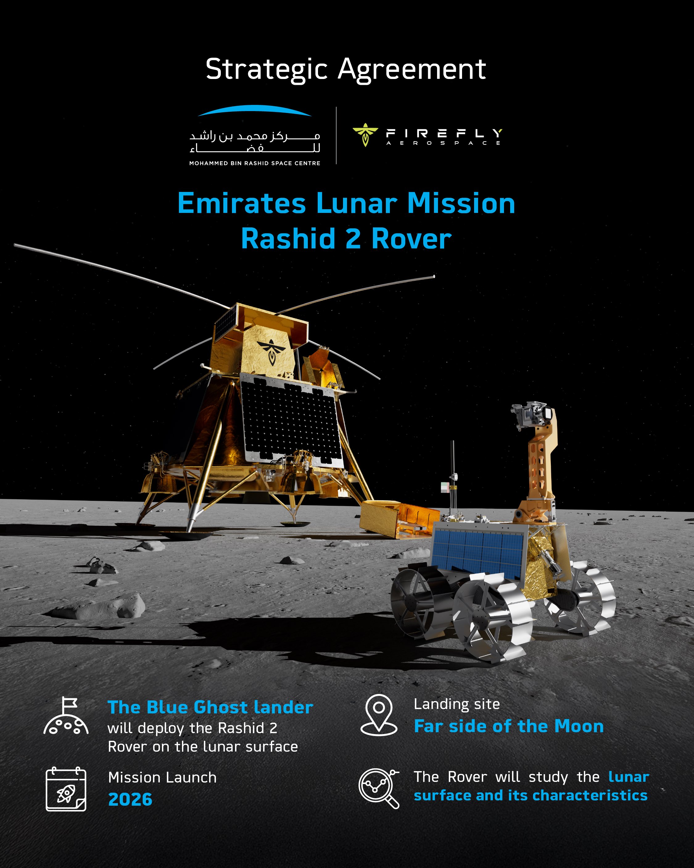 MBRSC (무함마드 빈 라쉬드 우주센터)는 자신들의 두 번째 달 탐사 로버인 라쉬드 2호 (Rashid 2)를 달 표면까지 운반해서 내려줄 파트너로 이번에는 미국 회사인 파이어플라이 에어로스페이스 (Firefly Aerospace)를 선정했습니다.