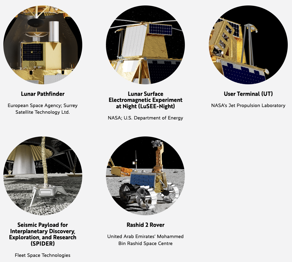 착륙선에는 UAE의 라쉬드 2호 외에도 NASA, 미국 에너지부 (DoE), NASA 제트추진연구소 (JPL), 호주우주청 (Australian Space Agency) 등 여러 기관의 각종 탐사 장비가 함께 탑재됩니다.