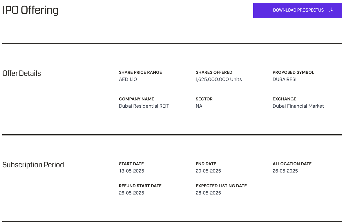 2년 전 그런 소식을 접하고는 별생각 없이 두 증권 거래소의 앱을 다운받아 등록만 해놓고 써먹지 않다가 5월초 두바이 정부 소유의 지주회사 두바이 홀딩의 자회사 중 하나인 두바이 레지덴셜 리츠(Dubai Residential REIT)가 두바이 증권 거래소의 올해 첫 IPO를 진행한다기에 경험삼아 공모주 청약에 한번 참가해 봤습니다. 두바이 레지덴설 리츠는 걸프협력회의 (GCC) 지역 최초의 순수 주거 임대에 집중된 리츠로, 상장 당시 35,700개의 주거 유닛을 관리하며 GCC 최대 규모의 리츠로 자리매김하고 있는 회사이고, 두바이의 부동산 사업은 잘 굴러가고 있으니 말이죠.