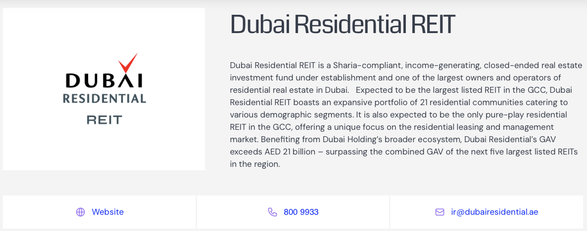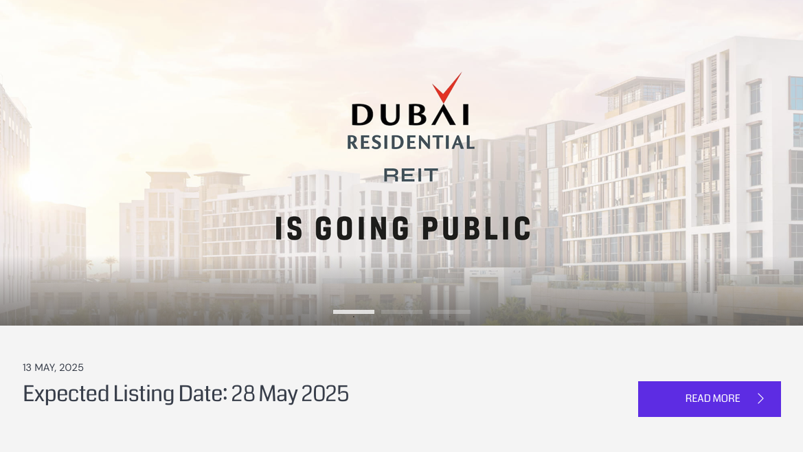 2년 전 그런 소식을 접하고는 별생각 없이 두 증권 거래소의 앱을 다운받아 등록만 해놓고 써먹지 않다가 5월초 두바이 정부 소유의 지주회사 두바이 홀딩의 자회사 중 하나인 두바이 레지덴셜 리츠(Dubai Residential REIT)가 두바이 증권 거래소의 올해 첫 IPO를 진행한다기에 경험삼아 공모주 청약에 한번 참가해 봤습니다. 두바이 레지덴설 리츠는 걸프협력회의 (GCC) 지역 최초의 순수 주거 임대에 집중된 리츠로, 상장 당시 35,700개의 주거 유닛을 관리하며 GCC 최대 규모의 리츠로 자리매김하고 있는 회사이고, 두바이의 부동산 사업은 잘 굴러가고 있으니 말이죠.