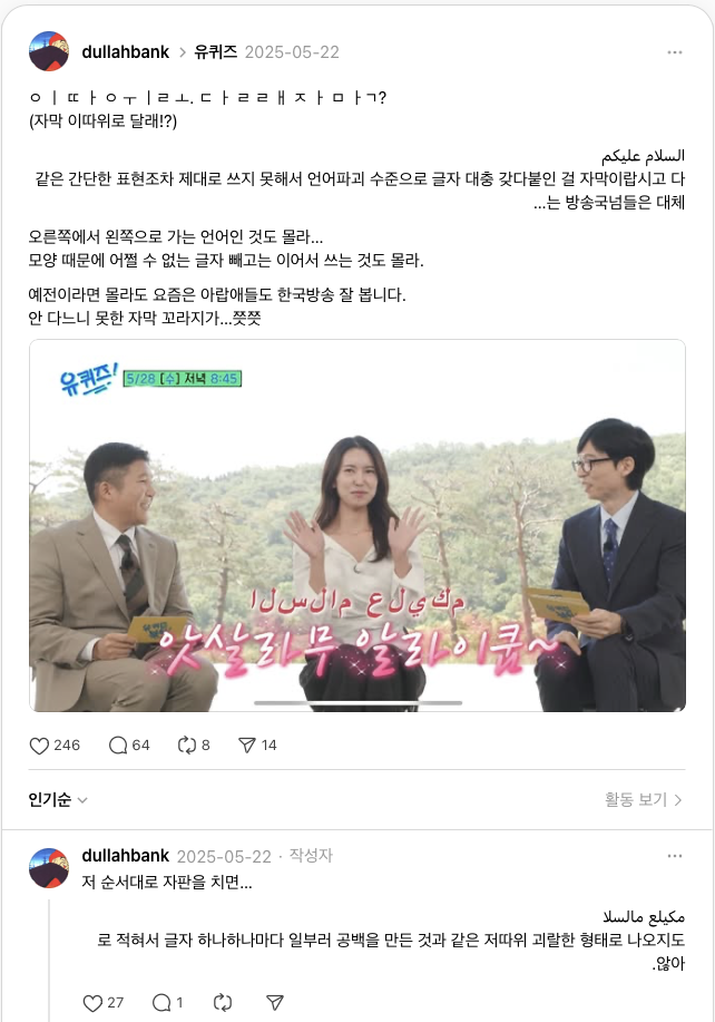 유퀴즈는 요즘에는 셀럽들도 많이 출연해서 한국어를 공부하는 아랍인을 포함한 외국인들에게도 보기 좋은 토크쇼일 텐데, 저런 식의 자막이 달렸다는 게 너무 창피할 수밖에요. 더군다나 그 간호사의 출연분 예고를 "사우디의 모든 것을 알려드립니다"라며 마무리했는데, 정작 출연자의 아랍식 인사 자막을 괴랄하게 박아놨으니...