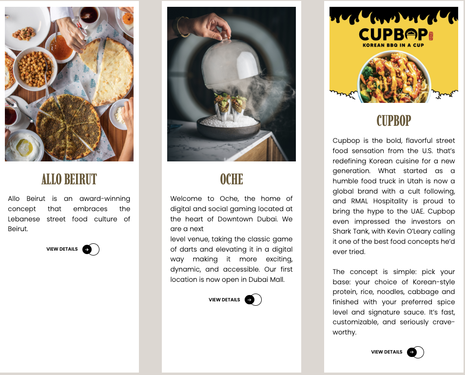 컵밥과 프랜차이즈 계약을 맺은 UAE 현지 업체는 Rmal Hospitality로 개인적으로 종종 가는 알로 베이루트를 비롯한 여러 F&B 체인을 운영하고 있는 업체입니다.