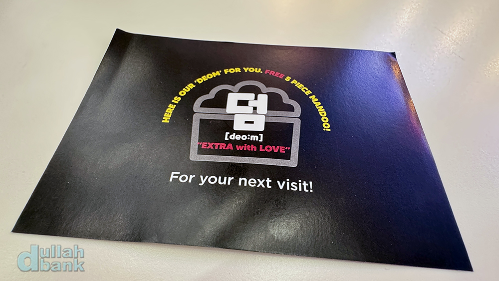 첫 방문이라고 만두를 하나 더 주더니 개점 기념이라며 7월말까지 재방문시 덤으로 사이드 메뉴를 주는 "덤" 쿠폰을 주더군요.