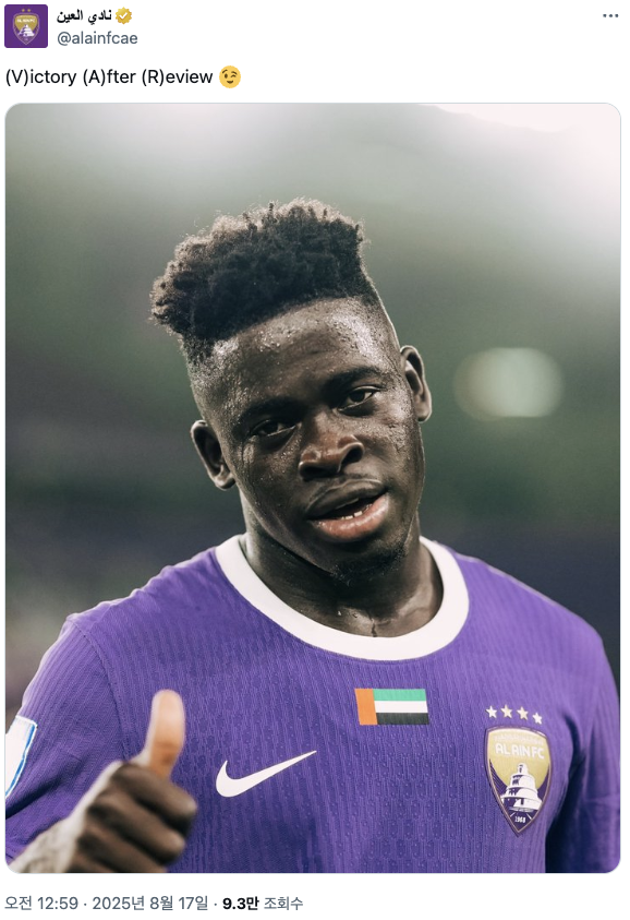 4) 박용우 풀타임. 알아인과 알바따이흐의 경기에서는 VAR판독으로 인한 두 골 취소 등 어수선한 상황에서 나온 2005년생 미드필더 압둘카림 트라우리의 결승골을 앞세운 알아인이 결국 2대1 승리를 거두었습니다. 알아인과 한 시즌 더 동행을 선택한 박용우는 풀타임을 소화하며 팀의 승리에 기여했고, VAR 판독으로 두 골을 잃고 한 골을 허용한 것에 빡친 알아인은 경기 후 리그측에 공식 항의성명을 보내고, 소셜 네트워크 계정을 통해 주심의 판정을 조롱하는 짤을 올릴 정도였습니다.