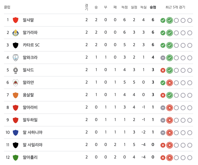1) 개막전에서 알사드를 잡았던 카타르는 알사일리야와의 경기에서 루카스 칼바치의 결승골로 2대0 승리를 거두고 2연승을 달리며, 알사일리야를 2연패에 빠뜨렸습니다.