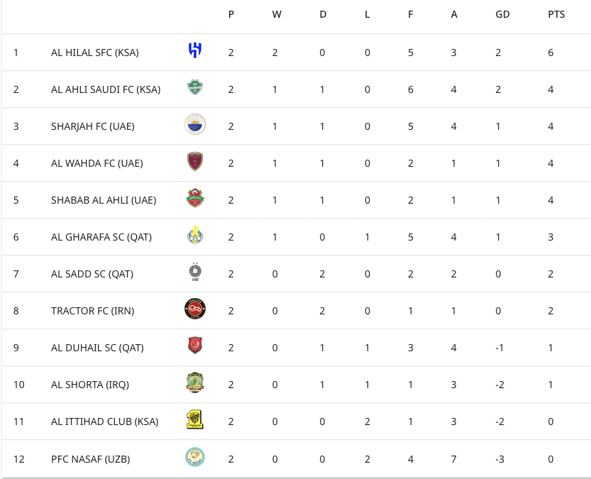 6) 지난 주 리그에서 알나스르에게 완패한 후 로랑 블랑 감독을 경질하고 감독 대행체제로 첫 경기를 펼친 지난 시즌 사우디 리그 챔피언 알잇티하드와 UAE 리그 챔피언 샤밥 알아흘리의 2라운드 마지막 경기에서는 사이드 에자톨라히의 선제골을 끝까지 잘 지킨 샤밥 알아흘리가 0대1 승리를 거두고 첫 승을 신고하며 알잇티하드를 2연패에 빠뜨렸습니다