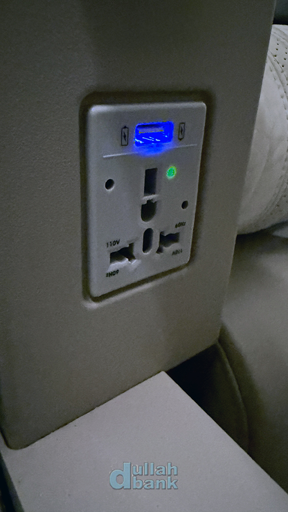 좌석과 좌석 사이의 하단부에 USB-A 타입 포트와 전원단자가 있습니다. 참고로 에미레이트는 10월 1일부터 기내에서 안전상의 이유로 보조 배터리 사용 및 전원 장치로부터의 충전을 금지했습니다.