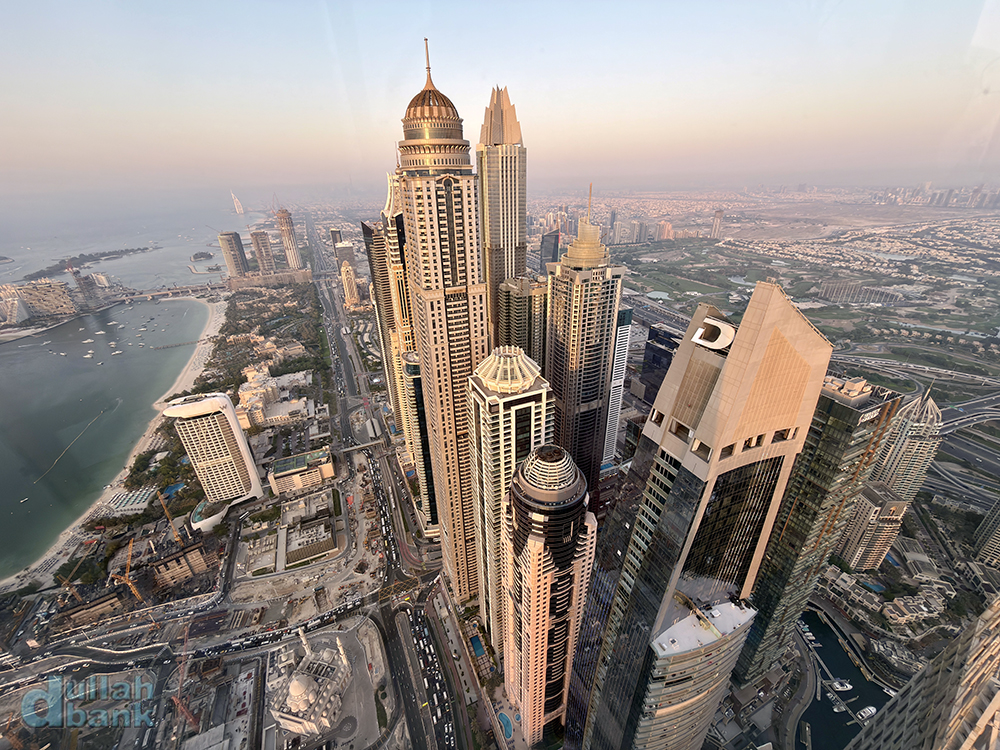 아라비안 걸프를 따라 180도의 파노라믹 뷰를 볼 수 있는 전면 뷰.
