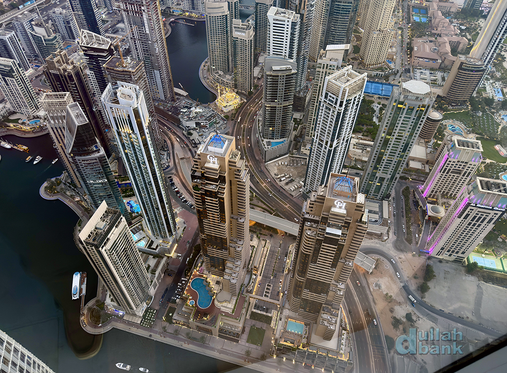 JW 메리어트 꼭대기 보다도 10m 정도 더 높은 대략 365m 높이에 자리잡은 라운지에서 내려다 본 두바이 하버 풍경. 지금은 마리나 옆에 휑하니 도로만 놓여져 있지만...
