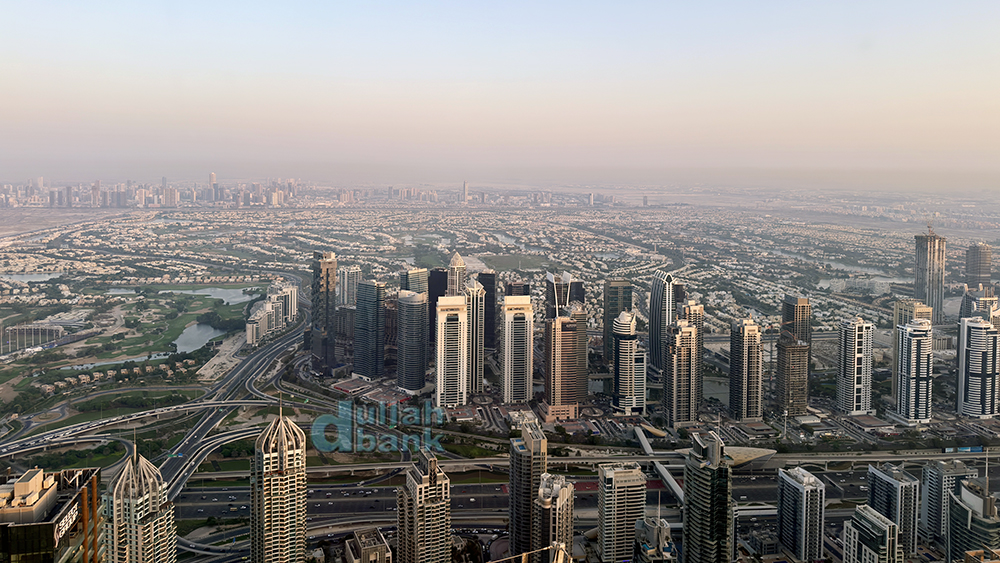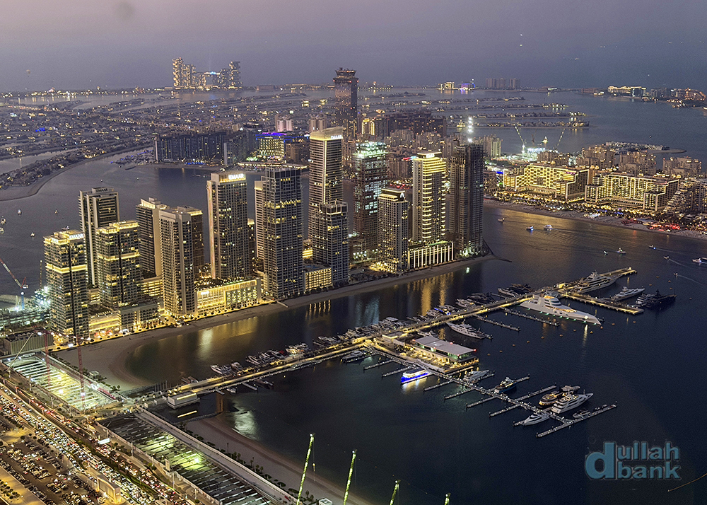 해가 지는 방향에 JBR 워크와 블루워터 아일랜드가 있습니다.