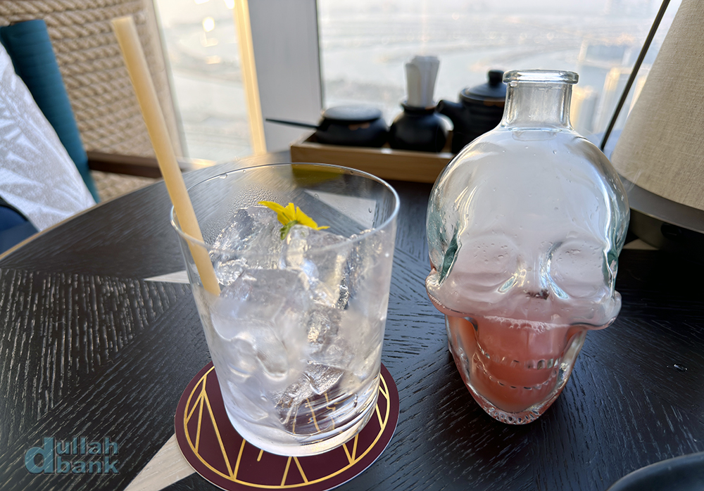 해질 무렵에 맞춰 예약하면 선셋 익스피리언스 (5~8시)라는 패키지 (195디르함)를 이용할 수 있습니다. 술 (칵테일, 와인, 맥주 중 택2)도 마실 수 있지만, 직접 운전해서 집으로 돌아가야 하기에 아쉬움을 뒤로 하고 추천 목테일 (무알콜 칵테일)을 하나 시키고,