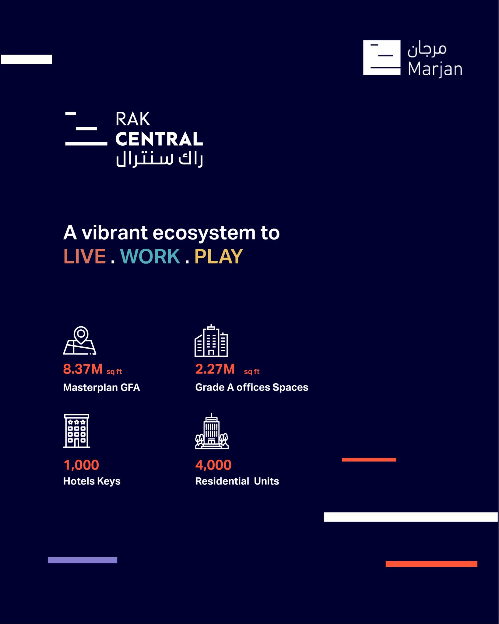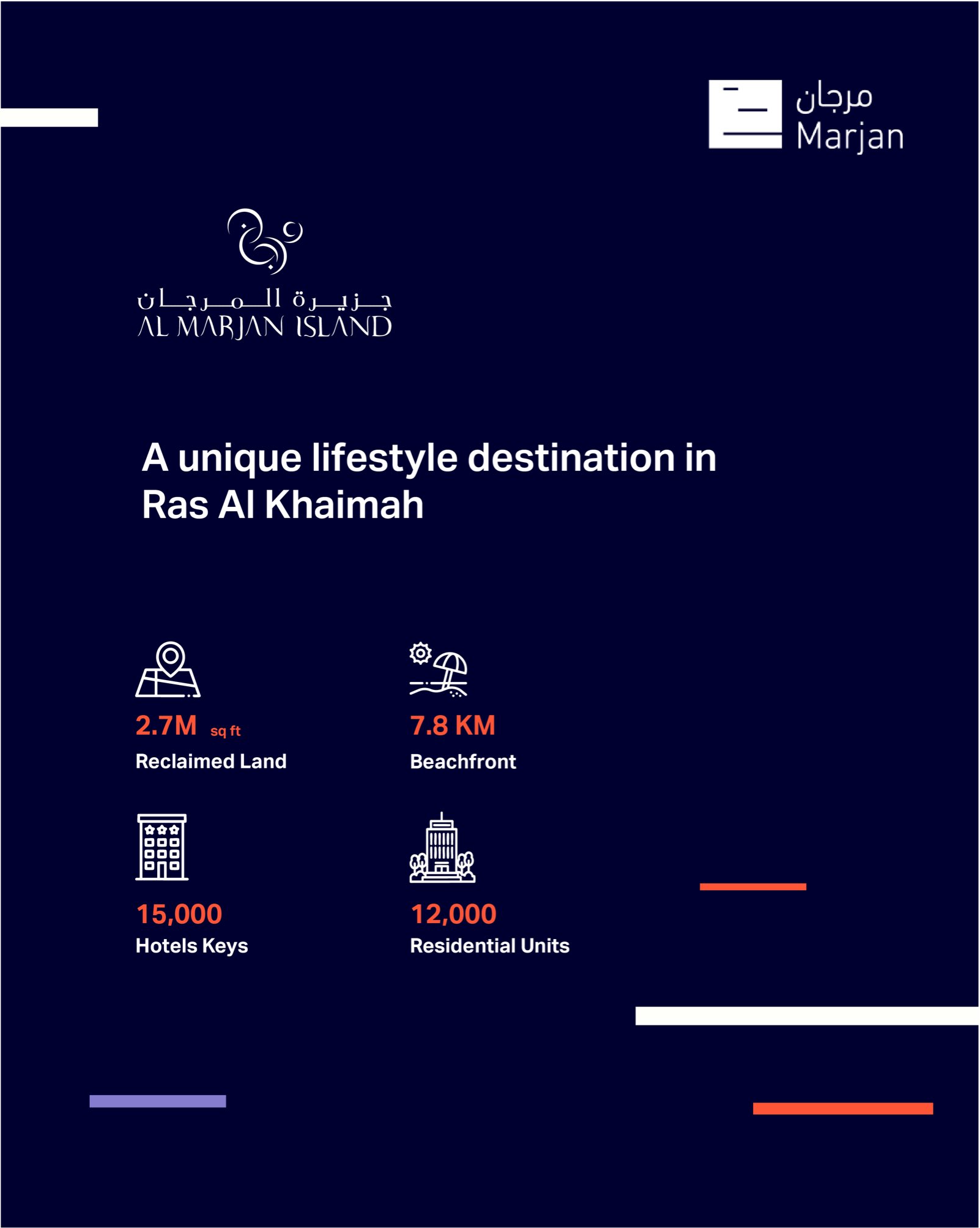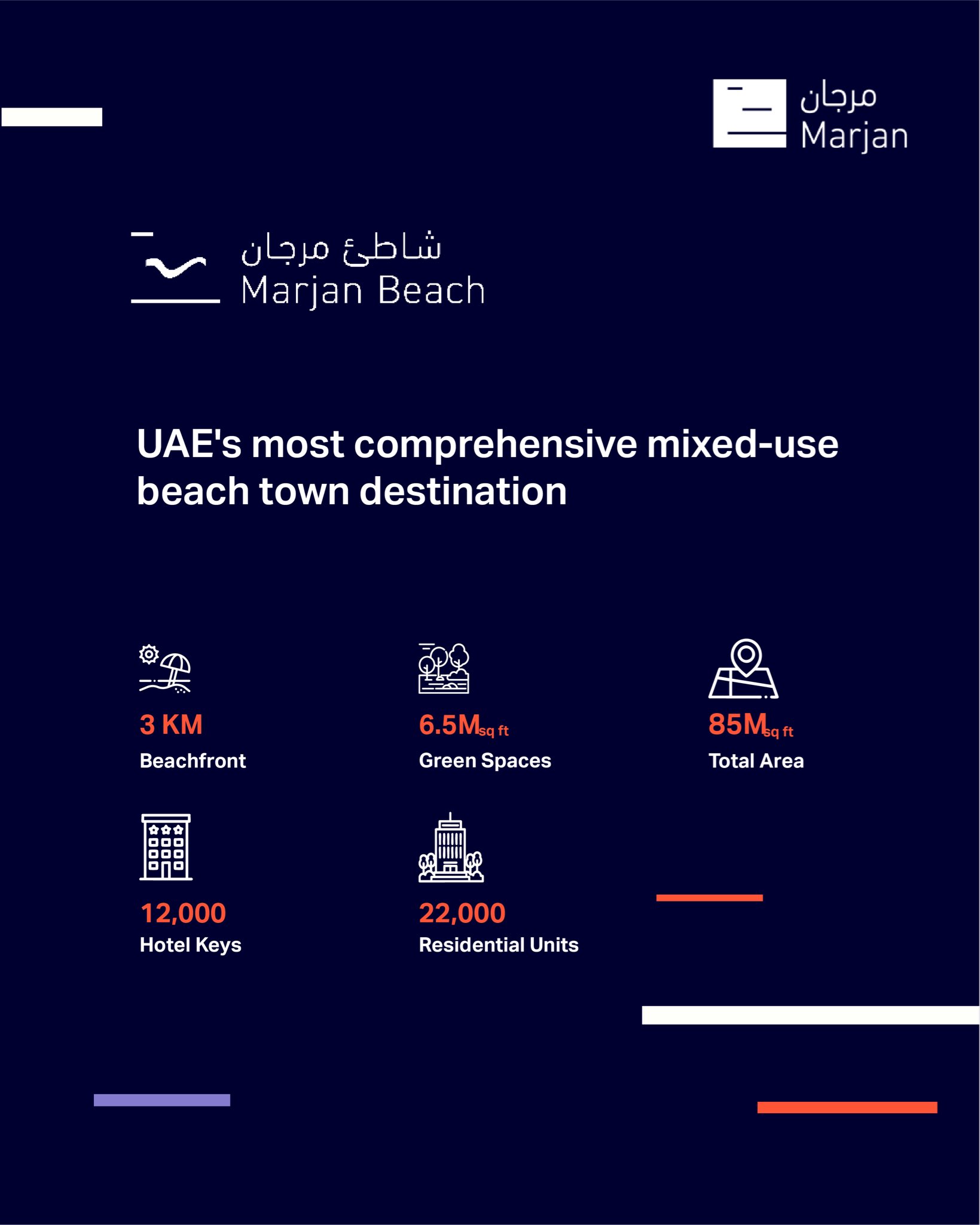 UAE에서 가장 포괄적인 복합용도 비치타운인 마르잔 비치에는 빌라, 레지던스, 아파트 등 22,000개의 집과 총 12,000객실의 호텔과 리조트를 유치해 74,000명의 거주민, 32,000명의 노동자 및 연간 최대 180,000명의 방문객을 수용할 예정입니다. 윈 카지노 리조트를 바라보는 3km의 청정 해변)과 약 60만 ㎡ 규모의 개방형 녹지를 조성하는 인프라 개선작업을 통해 커뮤니티 공공영역의 창출과 병렬되도록 계획하고 있습니다.