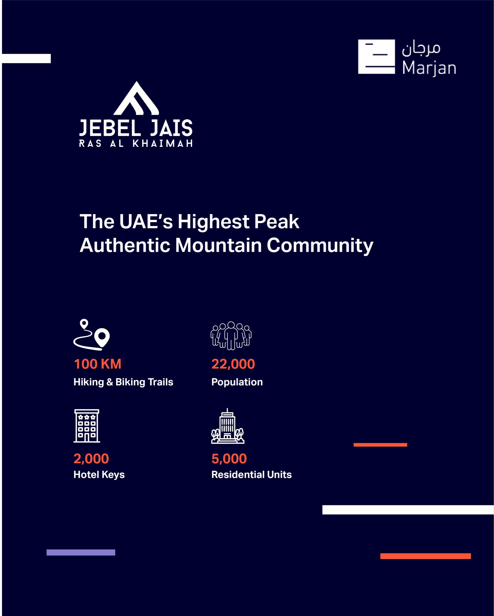 마르잔은 향후 5 년간 제벨 자이스 일대에 총연장 100 킬로미터에 이르는 하이킹·자전거 트레일을 개발하여 이 지역의 액티브 관광(active tourism)을 재정의하고 거의 없다시피한 거주지역과 호텔 등을 개발해 라스알카이마의 극적 자연풍경을 선보일 것입니다. 또한 마르잔은 세계적 수준의 문화 및 엔터테인먼트 이벤트를 통해 2만명 이상(festival fans)의 축제 방문객을 토후국으로 유치할 계획입니다.