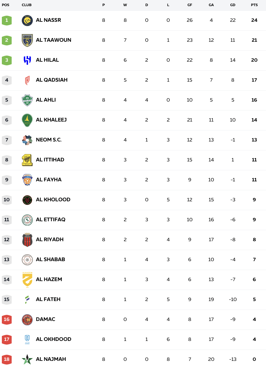 6) 7연패에 빠진 알나즈마와 4연승을 달리고 있는 알힐랄의 경기에서는 예상 외로 여섯골을 주고받는 대공방전 끝에 팀에게 패배를 안길 수도 있었던 자책골을 넣고 바로 결승골로 만회한 후벵 네베스의 원맨쇼와 살림 알도사리의 멀티골을 앞세운 알힐랄이 2대4 역전승을 거두고 5연승을 달리며 알나즈마를 8연패에 빠졌습니다. 최근 클린시트가 많았던 알힐랄은 수비진의 실수로 인해 스스로 자멸할 뻔했지만, 무너지기엔 알나즈마가 너무 약했습니다.