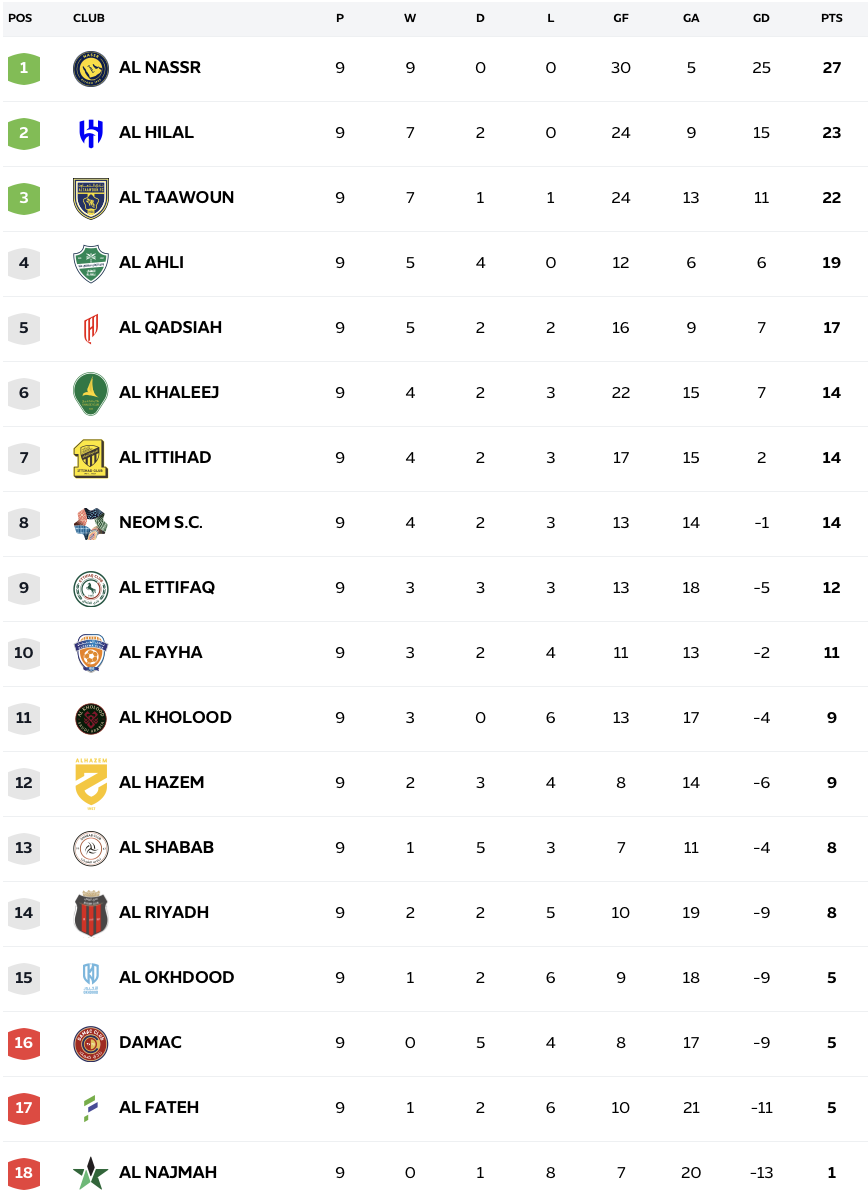 10) 7연승을 달리고 있는 알타아운과 승격팀 네옴의 경기에서는 후반 인저리 타임에 실점을 허용하며 패색이 짙던 알타아운이 인저리 타임 막판 왈리드 알아흐마드의 극장골로 1대1 무승부를 거두며 연승 행진은 끝냈지만, 패배는 면했습니다.