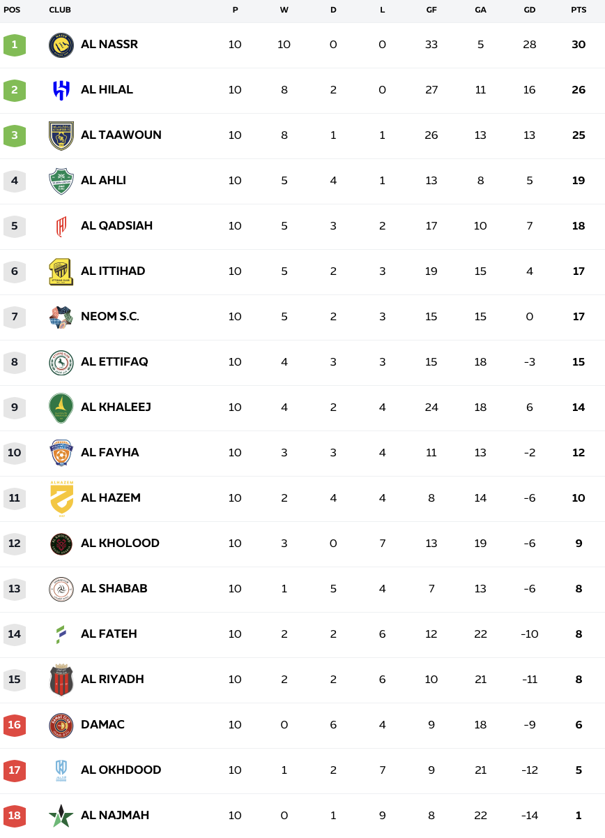 11) 알잇티하드와 두 경기 연속 무승부를 기록 중인 알샤밥의 경기에서는 아흐메드 알감디의 결승골을 앞세운 알잇티하드가 2대0으로 승리하며 2연승을 달렸습니다.