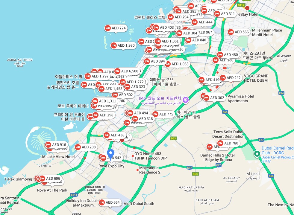 부킹닷컴 같은 예약 사이트를 확인해 보면 그 차이를 확연히 알 수 있는데, DWTC의 경우 두바이의 각종 숙박시설 중 33.5%가 전시회장 반경 5km 이내에 있어 선택의 폭이 넓은 반면, DEC의 경우 현시점에선 두바이의 각종 숙박시설 중 불과 0.2%만이 전시회장 반경 5km 이내에 있기 때문입니다. 두바이 엑스포 시티 내에는 현재 로브 호텔과 서비스 아파트 정도 밖에 없거든요.