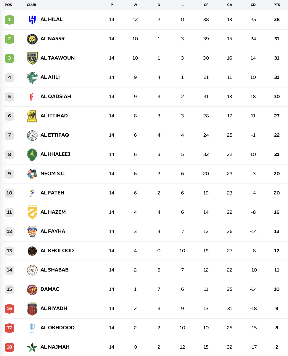 8) 3연승을 달리고 있는 알아흘리와 알타아운의 경기에서는 이바녜스의 퇴장으로 인한 수적 열세 속에서도 후반 인저리 타임에 얻은 페널티킥을 성공시킨 이반 토니의 극장골을 앞세운 알아흘리가 2대1 역전승을 거두고 4연승을 달렸습니다. 알아흘리가 승리함에 따라 리그 2위부터 4위까지 3개팀의 승점이 31점으로 같아졌고, 알힐랄전 패배로 2위 자리마저 내줄 뻔했던 알나스르는 가까스로 2위를 지켰습니다.