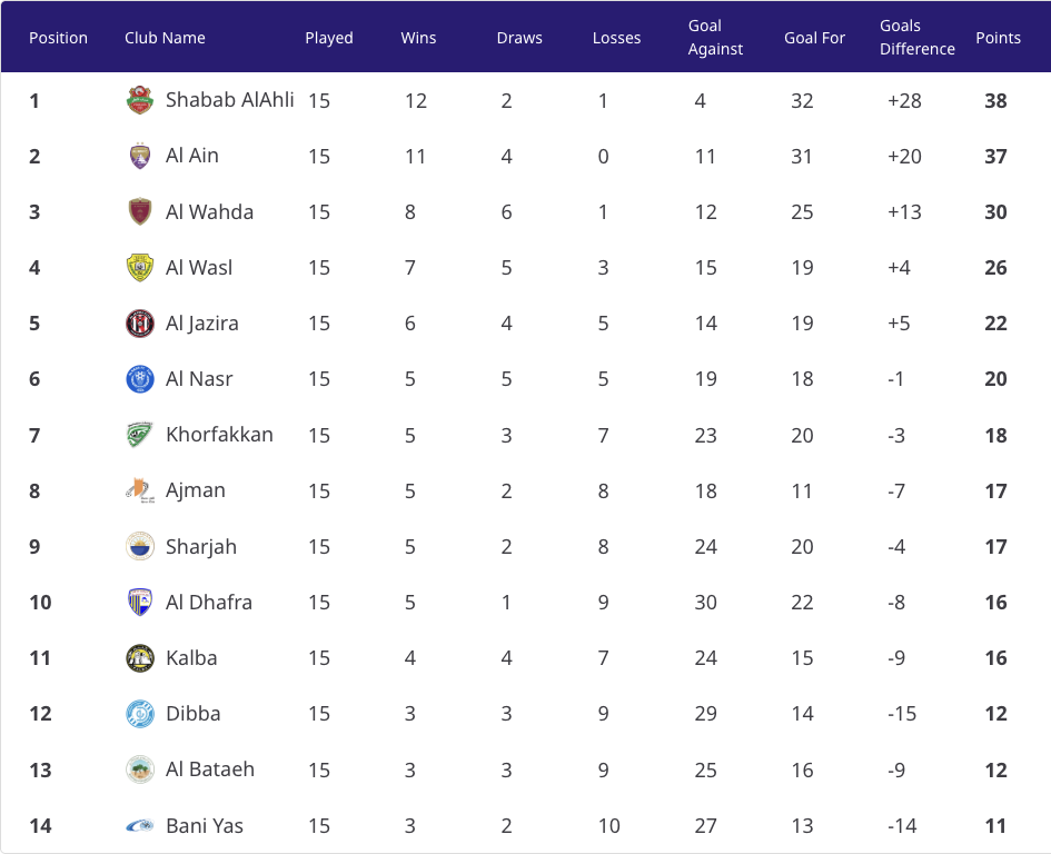5) 알자지라와 알아인의 아부다비 더비에서는 알레한드로 로메로의 결승골을 앞세운 알아인이 0대1로 승리하고 2연승을 달리며 선두 샤밥 알아흘리와의 1점차 승점을 유지했습니다.