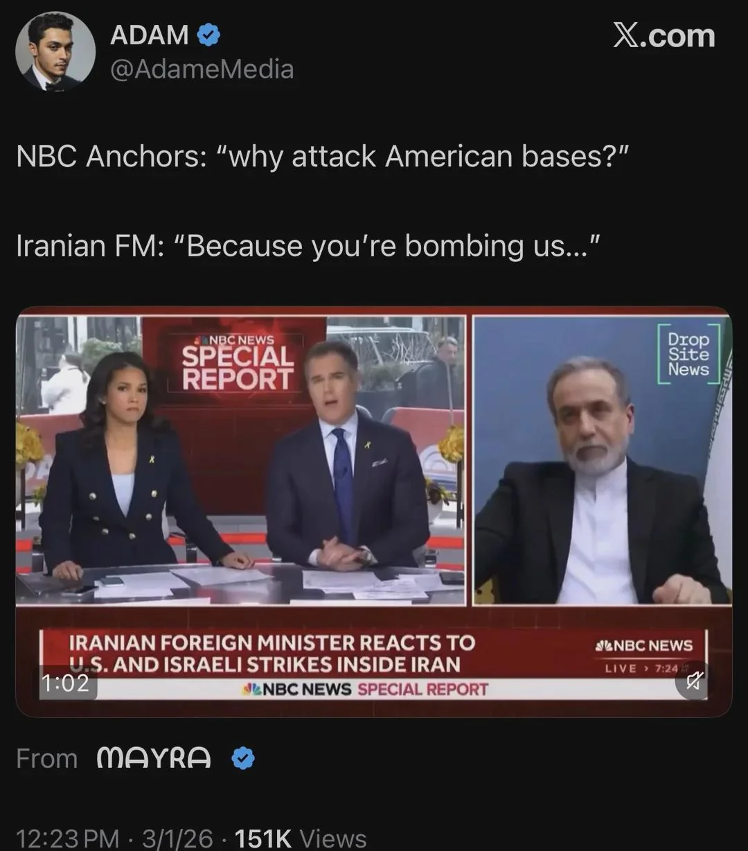 이 와중에 NBC 뉴스의 앵커는 이란 외무장관과의 인터뷰에서 왜 미군 기지를 공격하냐는 초등학생만도 못한 질문을 던지는게 바로 이중잣대 쩌는 미국의 인식을 극명하게 보여주고 있습니다.