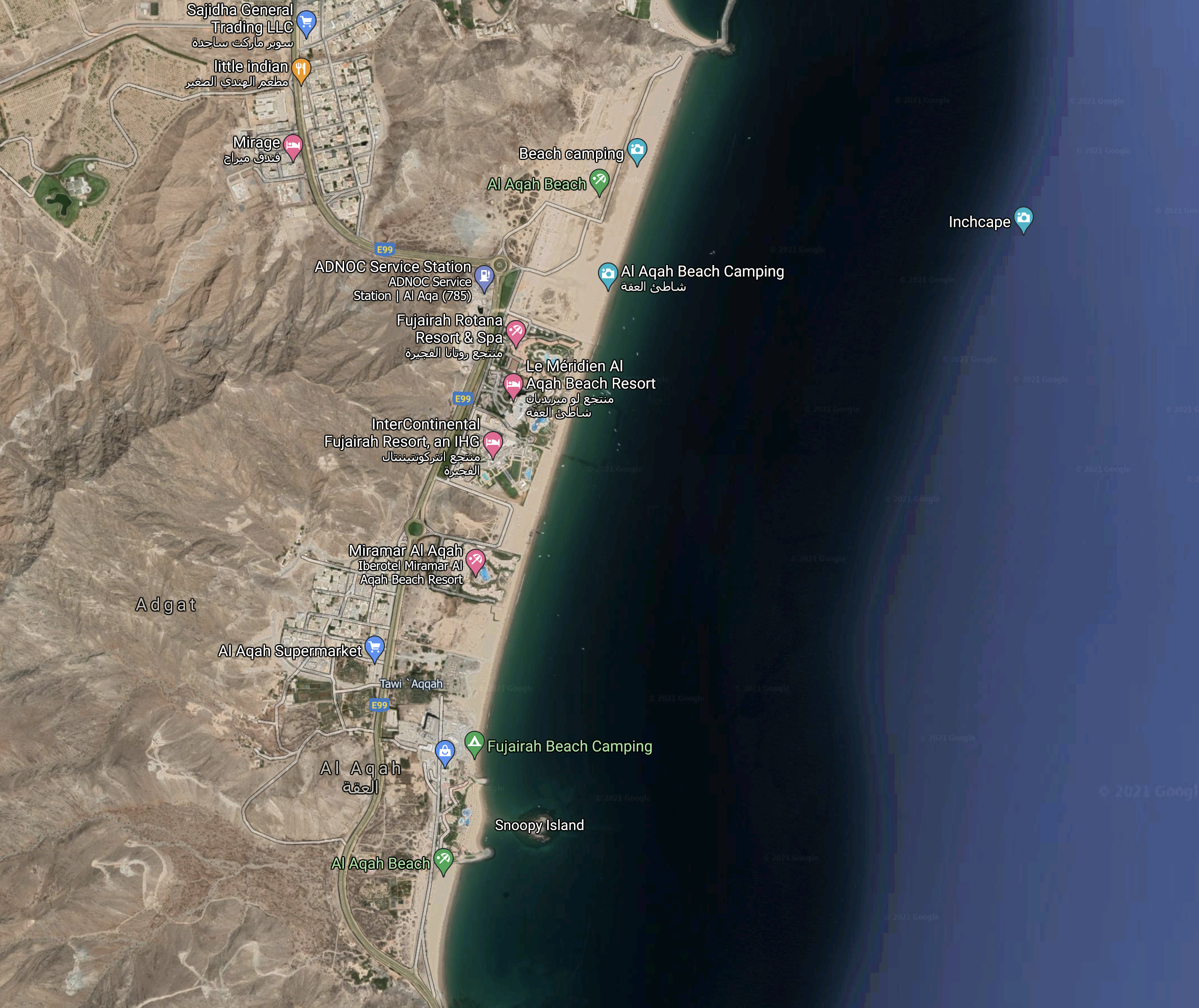2002년 12월에 개장한 르 메르디앙 알아까 비치 리조트는 푸자이라 방향에서 올라오다 보면 오른편에,