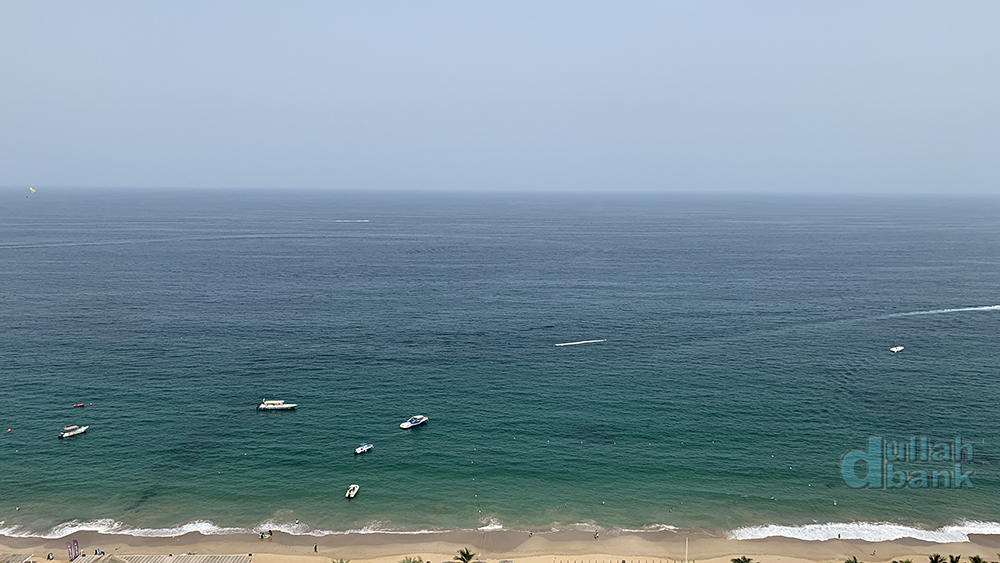 하지만, 창 밖을 열면 낡은 시설 따위는 잊게 만드는 멋진 경치가 펼쳐집니다. UAE 내 다른 토후국이 호르무즈 해협을 끼고 북쪽을 향한 아라비안 걸프 (일반적으로 페르시안 걸프로 알려져 있지만, 이란과 국경 분쟁 중인 UAE을 위시한 아랍국가에서는 아라비안 걸프라고 부르고 있다. 13/14시즌을 앞두고 UAE 리그가 리그 명칭을 아라비안 걸프 리그로 변경한다고 발표하자, 국경 및 명칭 분쟁 당사자였던 이란에서 UAE를 제소하고, 이란 축구협회에서 자국 선수의 이적을 막는 등 반발하는 해프닝이 있었다. 이는 우리와 일본이 동해와 일본해로 바다 명칭을 놓고도 분쟁이 있는 것과 마찬가지다.)를 향하고 잇는 것과 달리 동쪽에 자리잡은 푸자이라는 유일하게 토후국 영토 전체가 오만 만을 마주하고 있습니다. (샤르자의 월경지인 코르팟칸이나 칼바도 오만 만을 마주하고 있지만요. 어디까지나 일부라서...) 이런 지리적 위치로 인해 푸자이라에서는 바다에서 떠오르는 해를 볼 수 있지만, 다른 토후국과 달리 바다로 지는 일몰 풍경을 볼 수 없습니다.