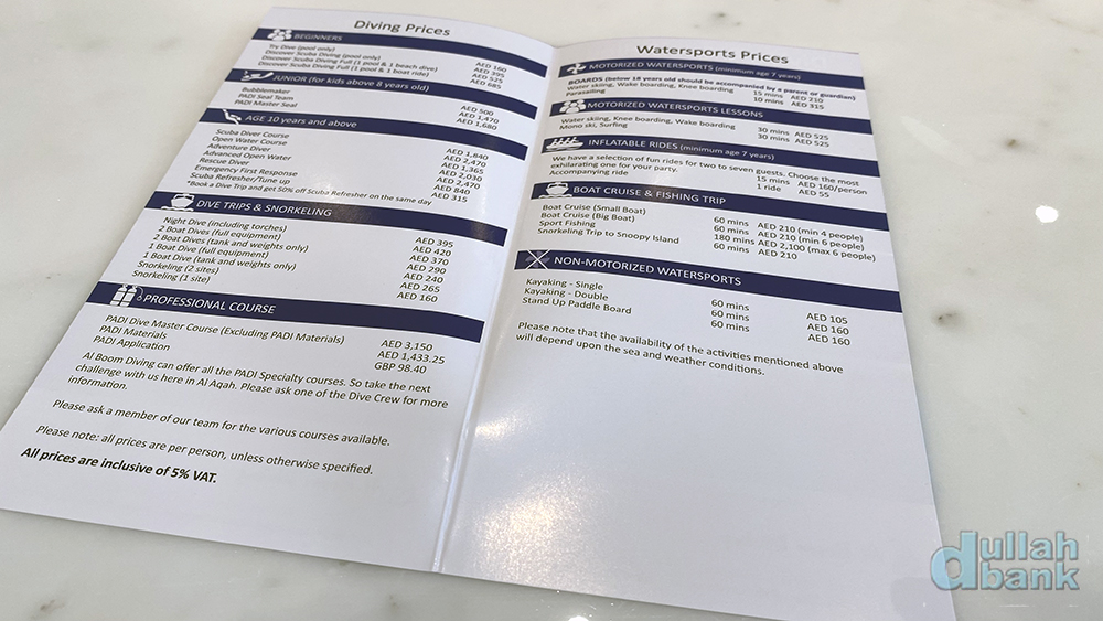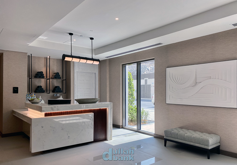 체크인 카운터 맞은 편에는 사진엔 담지 못했지만, 리조트 내 다이빙 센터가 본격 개장하면 영업할 듯한 액티비티 안내 데스크가 있습니다. 다이빙 센터를 통한 다이빙 및 워터스포츠 외에도 어드레스 푸자이라 리조트는 동절기에 대추야자농장 방문, 굴 양식장 체험 및 스노쿨링, 해질 무렵 셰프와 함께하는 바다 낚시, 산악 하이킹 등 계절에 따라 다양한 프로그램을 준비 중입니다. 운영이 본격화되면 두바이몰을 오가는 셔틀버스도 운영할 계획이라고 하네요. 두바이몰까지 왕복 4시간이 걸리는 나름 긴 여정인데.....
