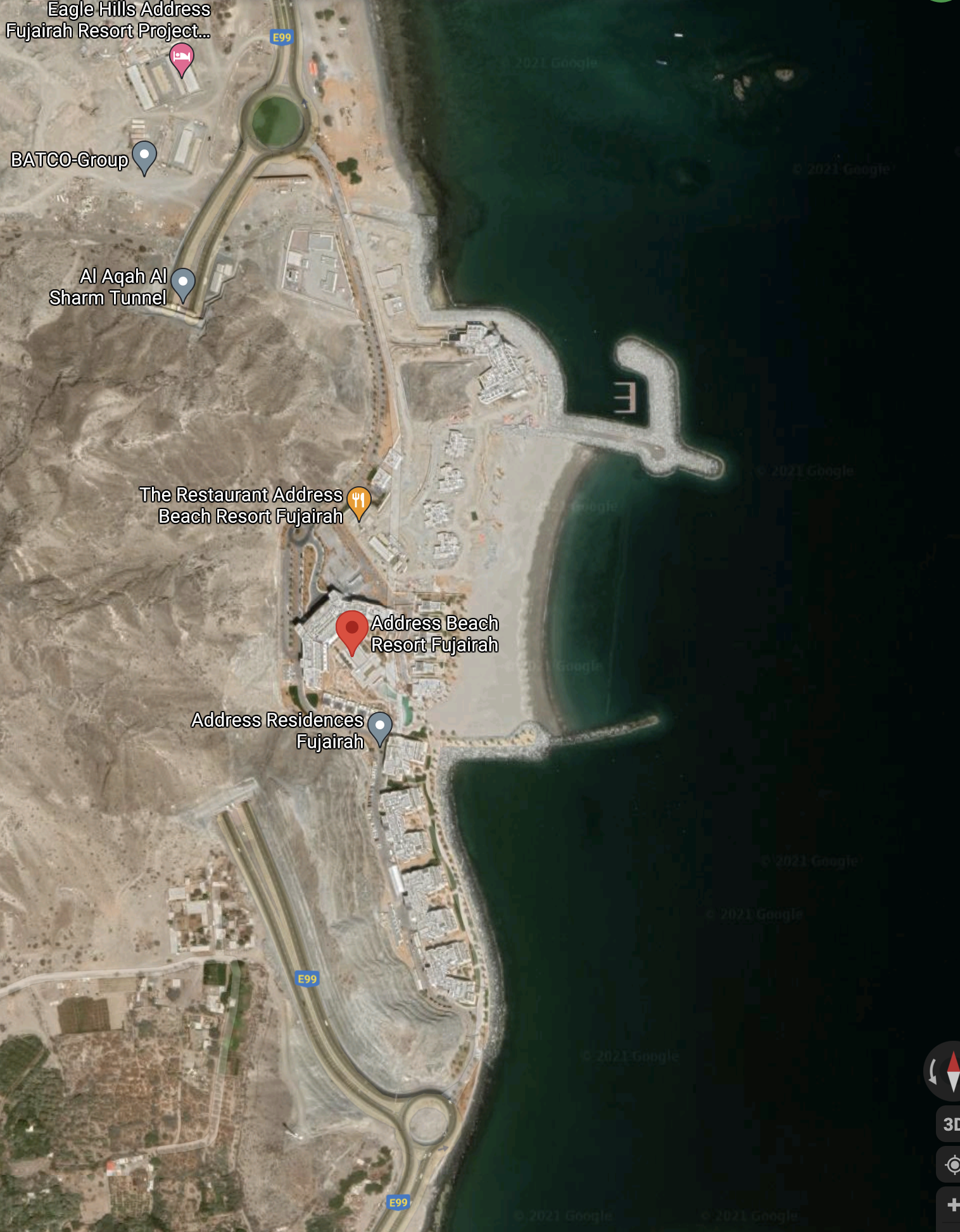 위 전경에서도 볼 수 있듯 산과 바다에 둘러싸여 있는 어드레스 푸자이라 비치 리조트는 뒷산에 가려 도로 상에서는 그 모습을 찾아볼 수 없습니다. 리조트에 가기 위해서는 알아까 비치를 벗어난 후 푸자이라로 내려가는 길에 만나는 터널 앞 라운드 어바웃에서 터널로 빠지지 말고, 좀더 돌아서...