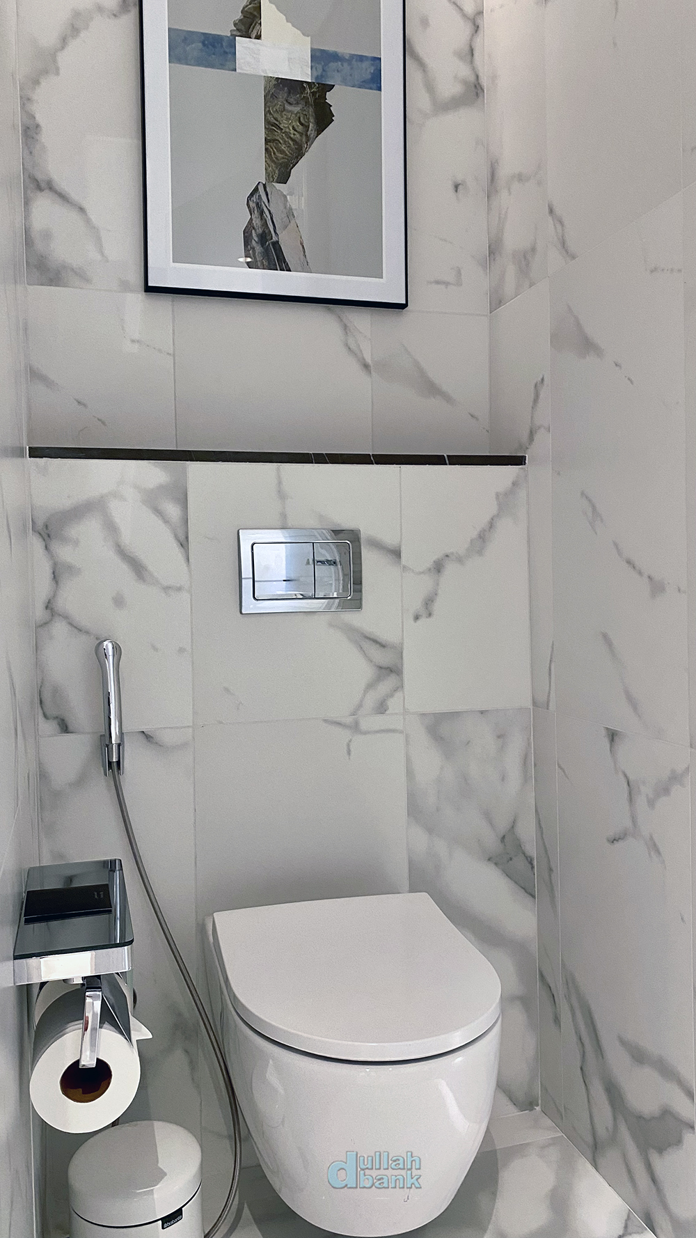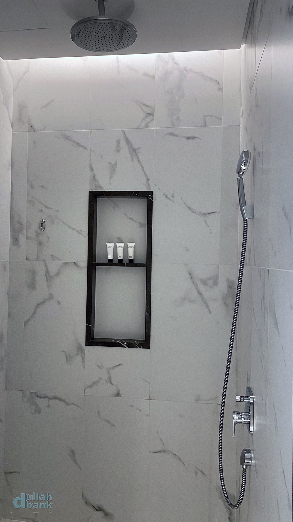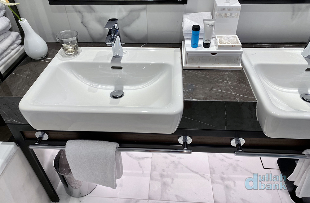 수납장과 미니바 맞은편에는 어드레스 다운 대리석벽으로 마감한 화장실이 있습니다.
