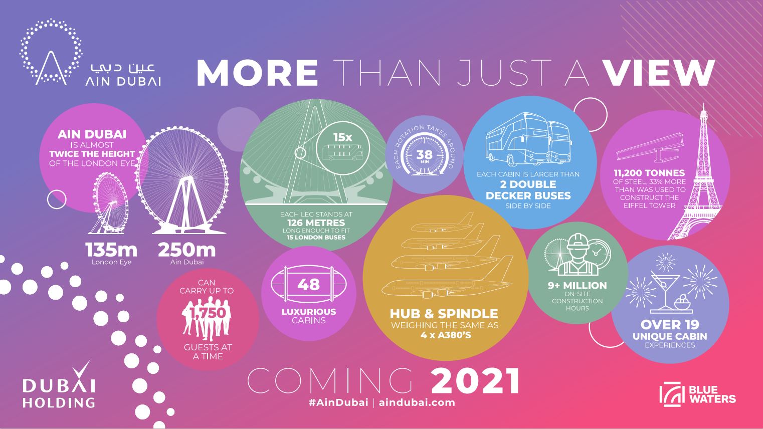 JBR 인근에 세워진 인공섬 블루워터 아일랜드의 상징이자 2014년 개장 이후 세계에서 가장 높은 대관람차였던 라스베가스의 하이 롤러 (167.5m)를 가볍게 제친 높이 250m의 세계에서 가장 큰 대관람차가 된 아인 두바이가 프로젝트 발표 8년 10개월만인 2021년 10월 21일 공식 개장했습니다.