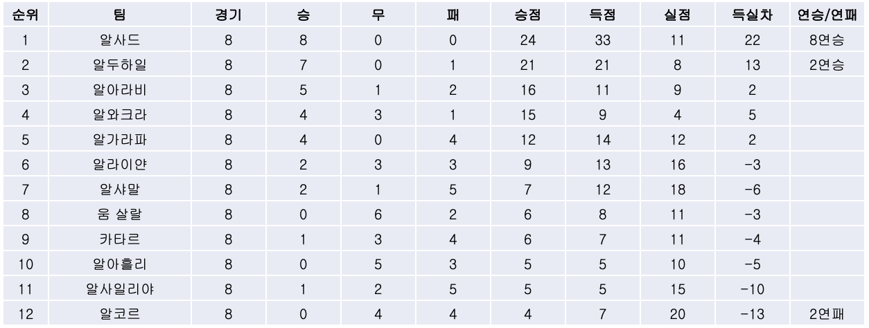 3) 구자철 결장. 이번 시즌 승리와는 거리가 먼 알코르는 승격팀 알샤말과의 경기에서 제이손 메디나와 바하 파이살에게 멀티골을 허용하며 4대0으로 대패했습니다. 알샤말은 2005년 10월 20일 알코르와의 경기에서 6대2로 이긴 이후 16년만에 리그에서 4점차 승리를 기록한 반면, 알코르는 3경기 연속 무승부 후 2연패를 당하며 대패와 함께 리그 최하위로 밀려났습니다. 구자철은 결장했습니다.