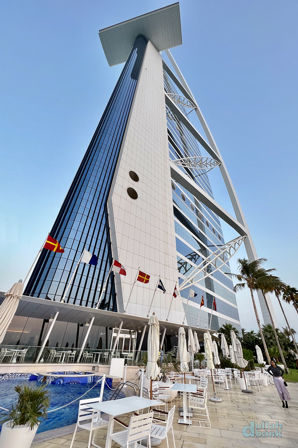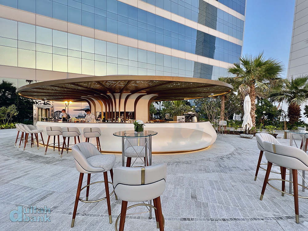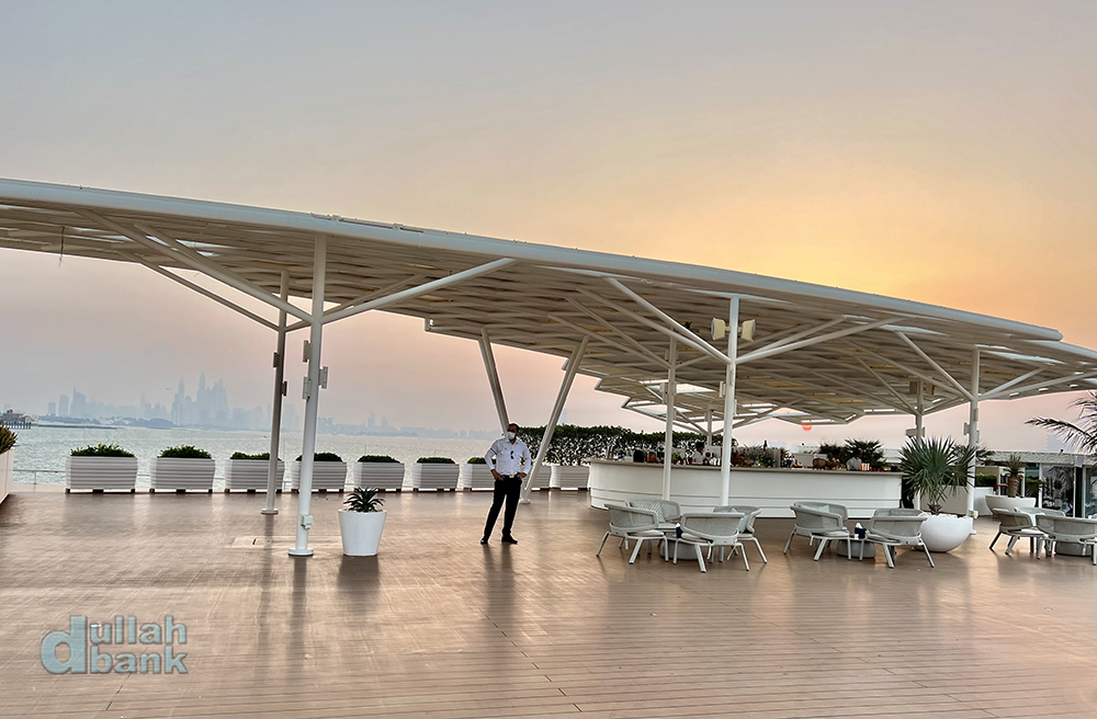 아래 보이는 초대형 플랫폼 테라스. 부르즈 알아랍 개장 이후 첫 확장구역인 이 테라스는 핀란드에서 공수해온 6개의 플랫폼을 조립해 만들어 2017년에 문을 열었으며, 두 개의 풀장과 라운지 살, 구찌 매장이 있습니다.