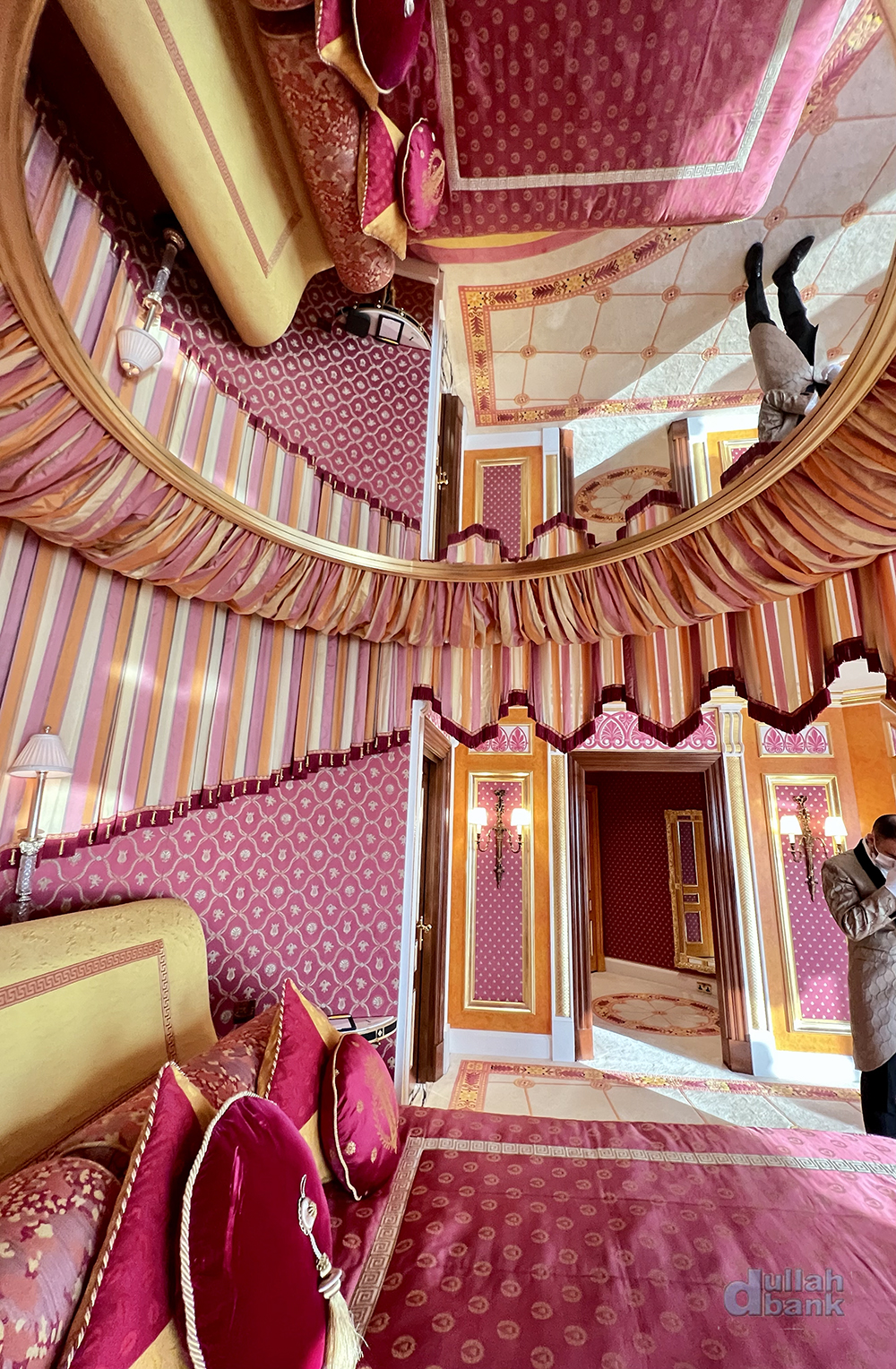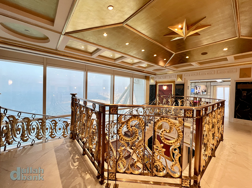 투어객은 엘리베이터 로비 안쪽에 있는 25층 로얄 스위트 (2실)로 연결되는 전용 엘리베이터를 타게 됩니다. 현재 부르즈 알아랍은 202개의 스위트룸 중 199실만 손님을 받고 있으며, 넬슨 만델라 등 VVIP 손님만 받았다는 25층의 로얄 스위트룸은 인사이드 부르즈 알아랍 투어용으로 사용하고, 추가로 1실을 내부용으로 사용 중이라고 하네요. 참고로 로얄 스위트룸 1박 투숙비는 25,000달러.