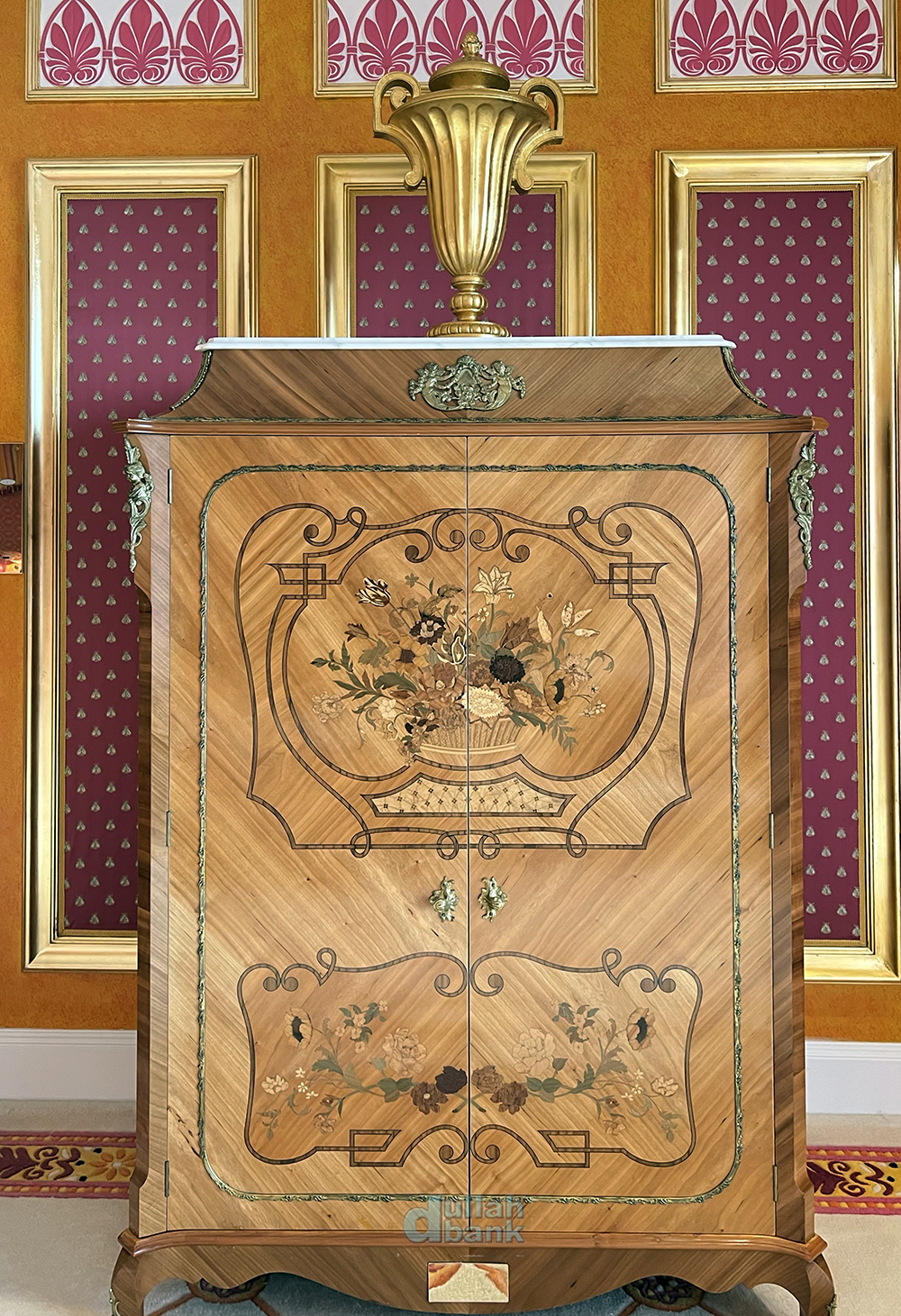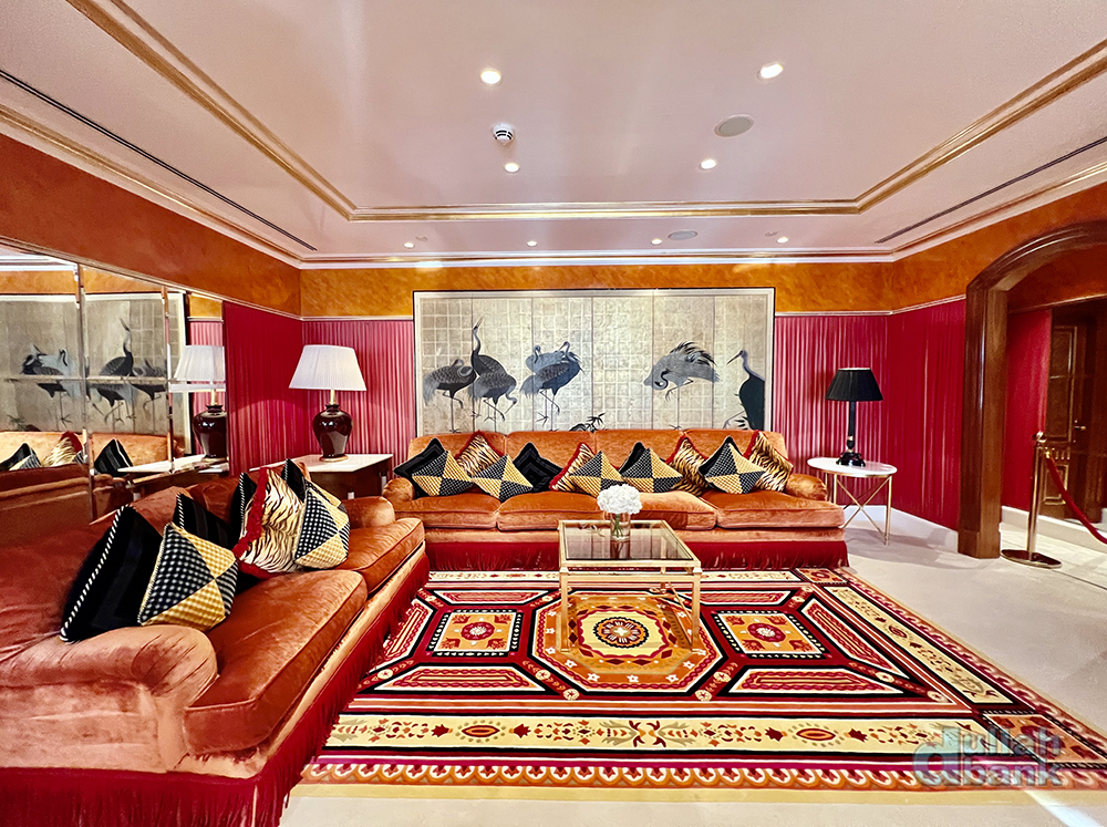 방 전체의 요란하고 화려한 색감은 셰이크 무함마드의 의중이 많이 반영된 결과물입니다. 주메이라 그룹이 부르즈 알아랍과 주메이라 비치 호텔을 짓고 있던 당시 40대 후반의 셰이크 무함마드 왕세제는 자신이 진행하는 첫 대형 프로젝트였던만큼 건설 현장을 시시때때로 찾아 진행상황을 확인하는 등 깊이 관여했다고 합니다. 당시 그를 모시는 곳에 있던 지인에 따르면 그가 새벽 2~3시에 불시에 현장을 방문할 때도 프로토콜에 따라 준비한 후 그를 맞이해야만 했기 때문에 수행직원들은 밤낮을 가리지 않고 긴장 상태였다고 하죠. 과장이 심하다 싶겠지만, 이런 그의 관리 스타일은 나이를 먹고 두바이 통치자가 된 후에도 이어져서 이른 아침 7시대에 두바이 정부 산하 사무실을 불시 시찰했다가 사무실에 아직 출근하지 않은 고위 관료들을 바로 해고시킨 바도 있습니다. 이르긴해도 출근시간이 지나 사무실을 방문했더니 벽에 걸린 자신의 초상화만이 자신을 맞이하고 있었다며 말아죠…