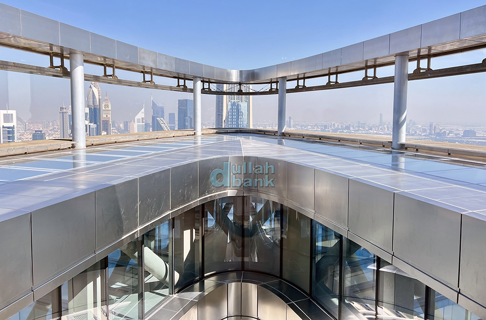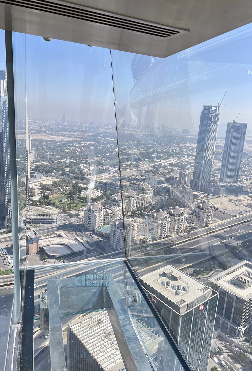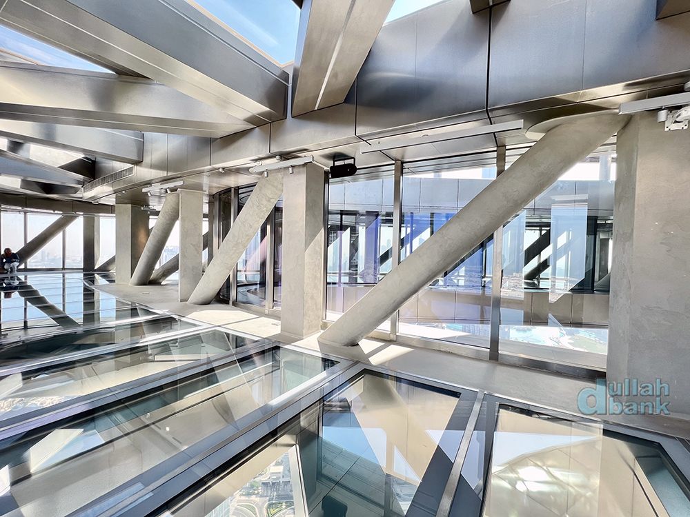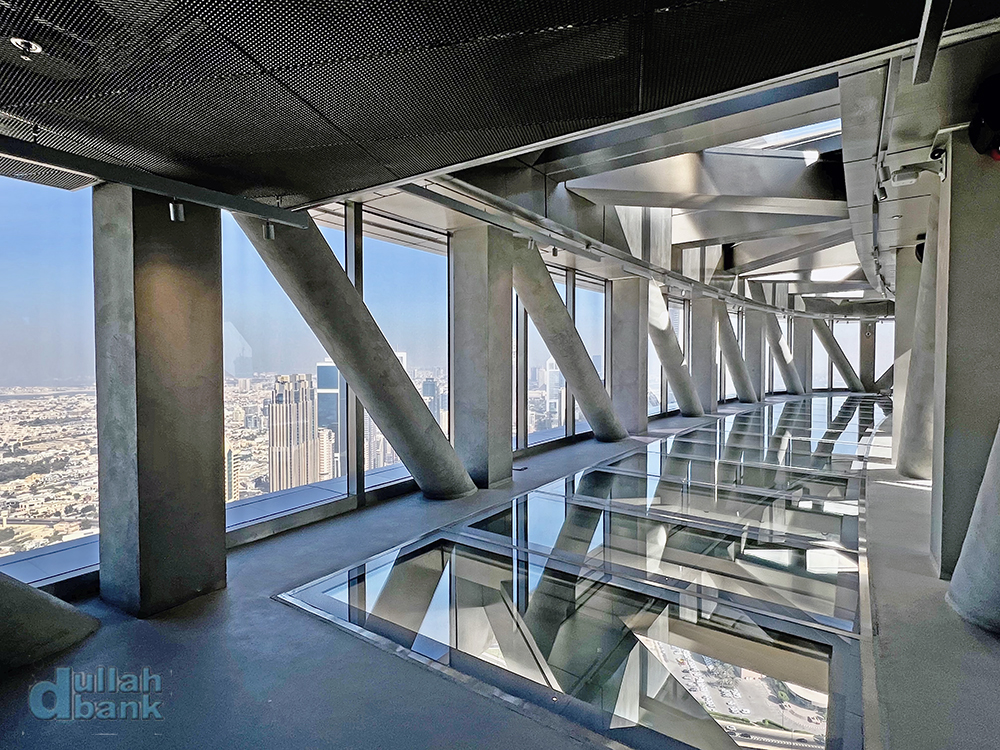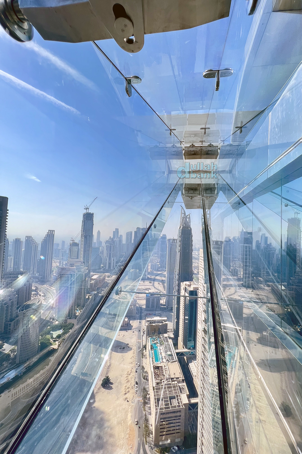 두바이 프레임보다 높은 곳에 자리잡은 이 유리 바닥은 불투명 차단막 없이 상시 밑을 볼 수 있습니다.