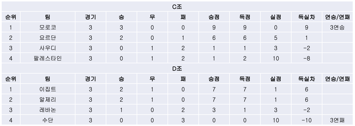 5) C, D조 결과에 따라 8강행 막차를 탄 요르단은 이집트와, 모로코는 알제리와 8강에서 맞붙게 되었습니다.