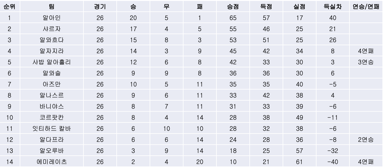 1) 리그 잔류를 위해 최소 무승부가 필요했던 알다프라와 무조건 승리가 필요했던 알오루바의 단두대 매치에서는 알오루바가 선제골을 넣으며 역전 잔류의 희망을 이어나갔지만, 수하일 알만수리의 역전 결승골을 앞세운 알다프라가 2대1 역전승을 거두며 리그 잔류에 성공했습니다. 승격팀 알오루바는 동점골을 허용한 후 다이렉트 퇴장으로 인한 수적 열세를 극복하지 못하며 한 시즌만에 다시 2부 리그로 강등되었습니다.