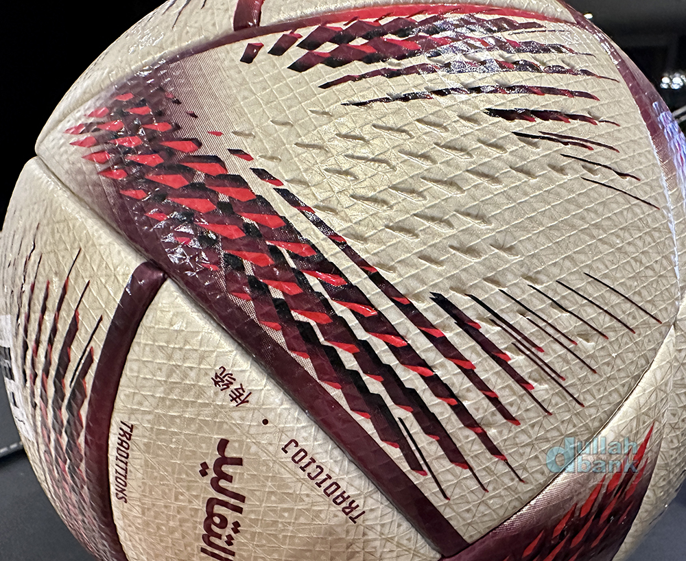 공을 감싸고 있는 화려한 도색은 수성 페인트로 작업했다고 하네요. 화이트 바탕에 다양한 색상이 들어간 알리흘라와 달리 알힐름은 메탈릭 골드를 바탕삼아 적갈색 (Maroon)으로 한 붉은색 계열을 채택하여 알리흘라에 비해 화려한 인상을 줍니다. 골드는 기본적으로 이쪽 동네 애들이 좋아라 하는 색상이고, 적갈색은 개최국인 카타르의 상징색이기에 이를 배합시킨 셉이죠.