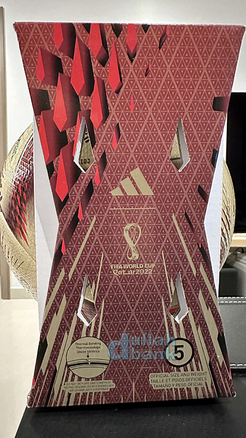 한쪽에는 카타르 월드컵 로고, 아디다스 로고와 함께 써말 본딩으로 접착했다는 설명과 공인구와 같은 크기와 무게의 5호구라는 설명이 있으며,