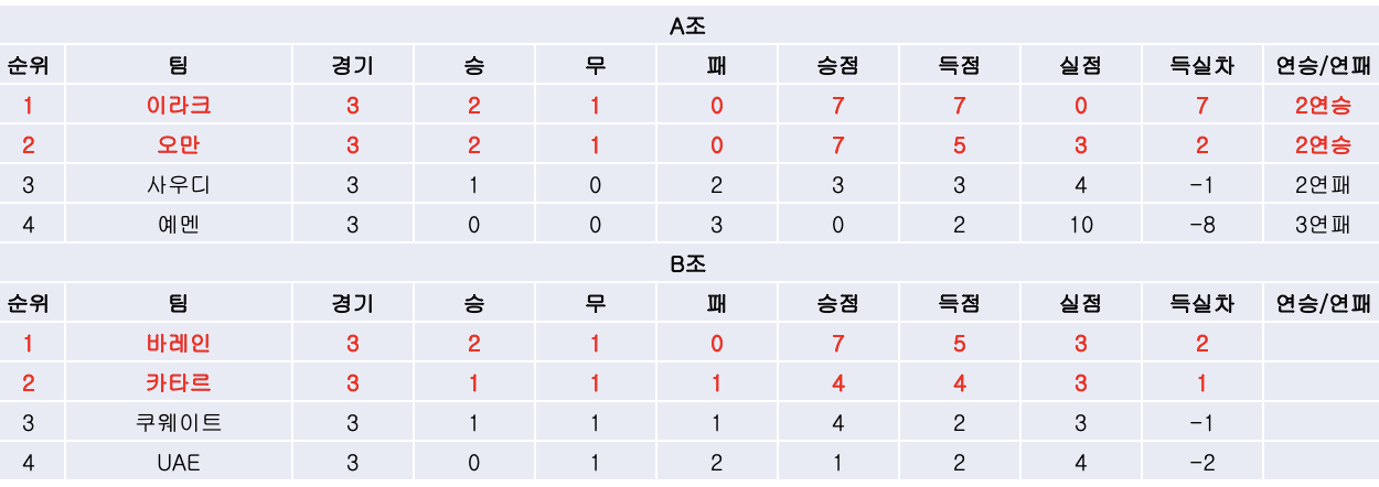 1) 개최국 이라크는 지난 라운드에서 예선 탈락을 확정지은 예멘과의 경기에서 무스타파 나딤의 결승골과 아이만 후세인 등의 멀티골을 앞세워 5대0 대승을 거두고 승점 7점으로 오만과 동점이었으나 골득실에서 앞서 조1위로 4강에 진출했습니다. 예멘은 후반 초반 두 차례 이라크 골문을 갈랐으나 잇달아 오프사이드 선언으로 골이 취소되면서 사실상 전의를 상실하고 추가로 4골을 허용하며 무너졌습니다.