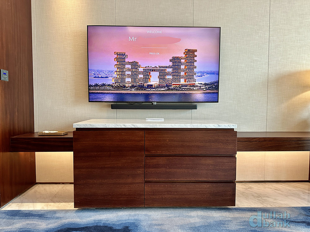 한국 채널은 안 나오지만 삼성 TV와 사운드바가 설치되어 있습니다. 메인 페이지 웰컴 메시지와 함께 호텔측의 메시지나 메뉴들이 한번에 보여지는 일반적인 메인 화면과 달리 심플하게 투숙객 이름과 호텔 전경이 커버 페이지처럼 사용되고 있습니다.