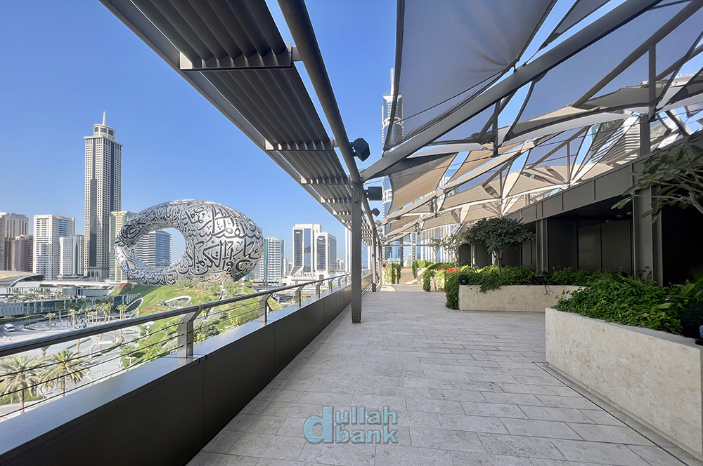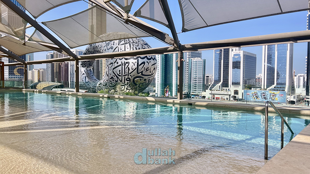 이 미래 박물관과 셰이크 자이드 로드를 바라보며 일광욕을 즐길 수 있는 풀이 있습니다. 곳곳에 구멍이 뚫린 듯한 건물 구조상 넓지 않은 게 아쉽긴 하지만요.