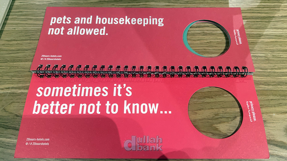 청소해 달라던가, 방해하지 말라던가 등의 의사표시도 예스러운 스타일에 맞게 램프가 아닌 책자를 통해 문고리에 걸 수 있는데, 책자에는 다양한 멘트들이 있어 취향에 맞게 걸어둘 수 있습니다.