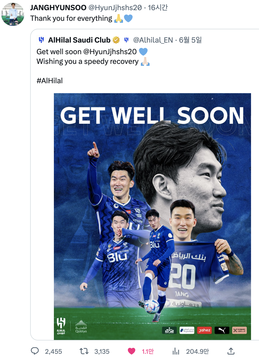 사실 장현수는 알힐랄과의 1년 연장 계약이 종료되었고, 양측이 재계약 협상 중인 과정에 질환이 발견되어 사실상 협상도 보류된데다 치료 일정이나 재활까지 포함하면 장기 결장이 확정된 상황인데 왜 알힐랄 구단은 그의 치료를 적극 지원하고 서포터즈들은 그를 응원하게 되었을까요?