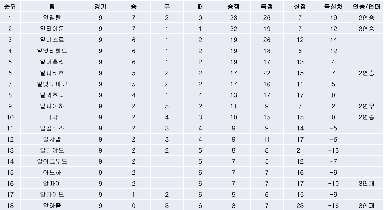 11) 알와흐다와 알파이하의 경기에서는 홈팀 알와흐다가 자우드 엘야믹의 동점골로 1대1 무승부를 기록하며승점 1점씩을 나눠가졌습니다.