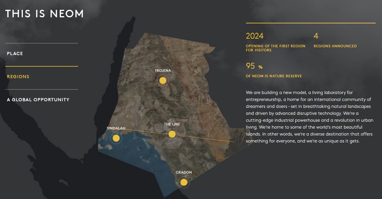 그동안 미개발 상태였던 홍해 일대 개발에 나서기 시작했던 무함마드 빈 살만 왕세자는 2017년 10월 24일 자신이 주최한 미래 투자 이니셔티브 컨퍼런스를 통해 사우디 내의 기존 규제와 제약에 벗어난 미래형 주거·사업용 신도시 '네옴'(NEOM)을 건설한다고 발표했습니다.