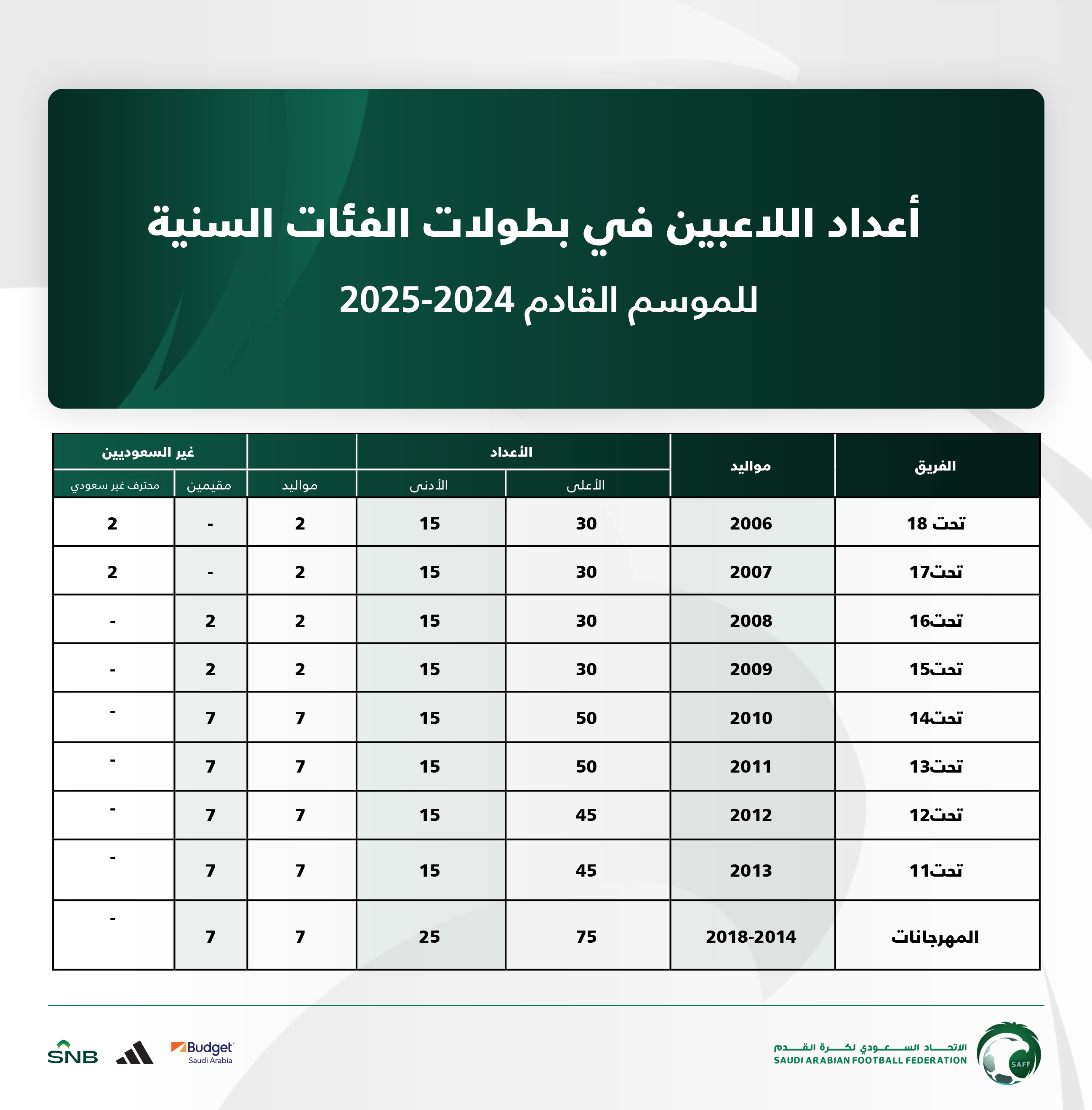 연령별 리그에는 외국인 쿼터를 좀더 세분화하여 사우디 출신 외국인과 사우디 (출신은 아니지만) 거주 외국인으로 나누었습니다. 쿼터를 보아하니 유소년에서 육성한 사우디 거주 외국인들은 17세 이하부터 외국인 선수로 등록될 수 있겠네요.