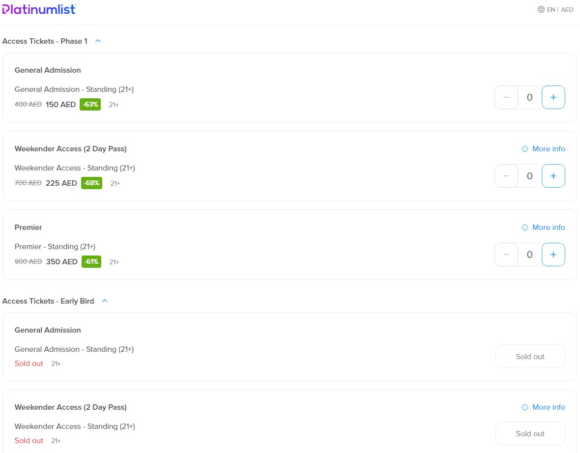 워터밤 두바이는 당초 예정인 4월 26일이 아닌, 라인업을 공개하지 않은 채 4월 29일부터 얼리 버드 예매를 시작했으며 몇 시간 만에 매진됨에 따라 30일부터 1차 판매에 들어갔습니다. 7일이나 8일 이틀 중 하루를 선택할 수도, 할인된 가격에 2일권을 구매할 수 있습니다.