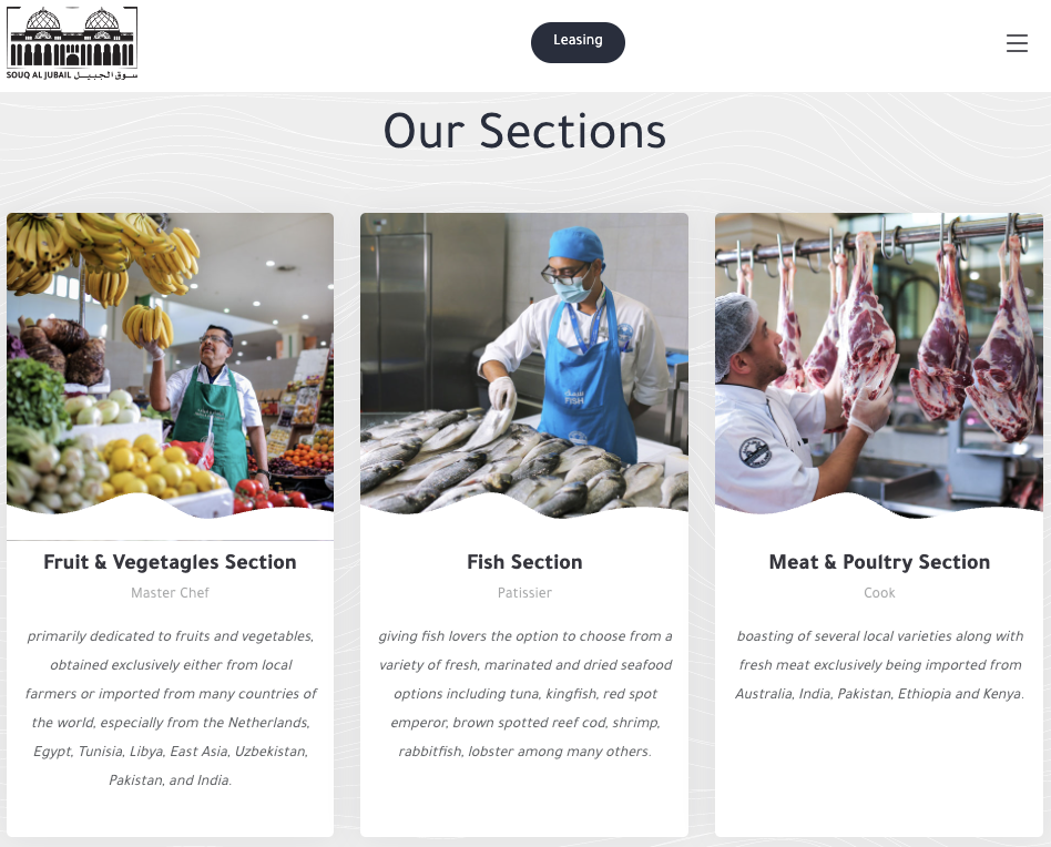 영어로 분명하게 적혀있듯 수끄 알주베일 (주베일 시장)은 칼바에 자리잡은 신선식품 판매 시장입니다. 작년말 개장한 이 시장의 간판에 굳이 수산 시장이라고 쓰여있지 않은 이유는 신선한 청과물과 야채, 어류, 육류 등 전반을 판매하는 종합시장이기 때문이죠. 우리로 치면 가락동농수산물시장이랄까요?