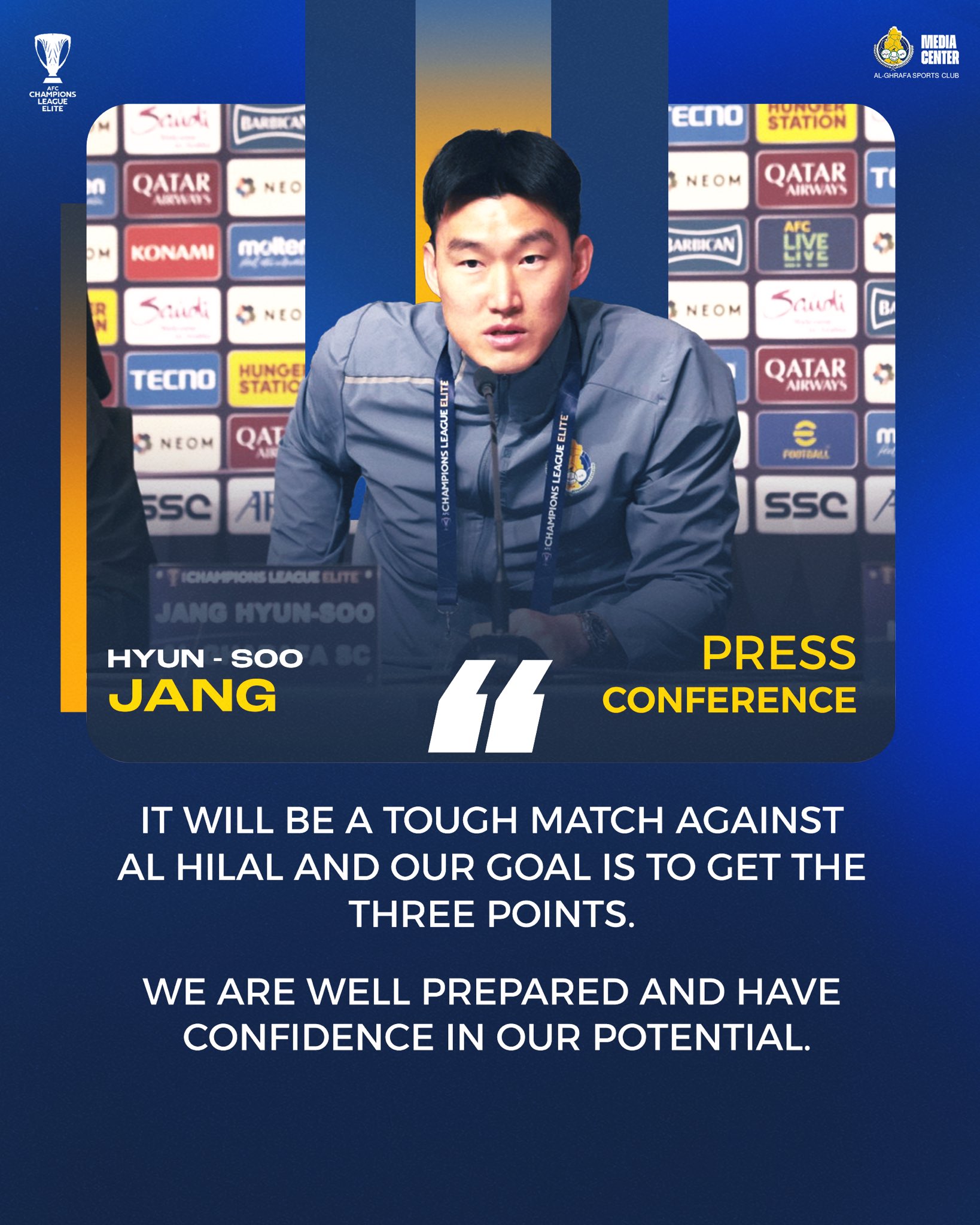 7) 부상으로 전력에서 제외되어 있다가 지난 라운드 경기에서 대기 명단에 이름을 올리며 복귀 준비를 알렸던 장현수가 전성기를 보냈던 알힐랄과의 맞대결을 앞두고 프리매치 기자회견에 참석했습니다.
